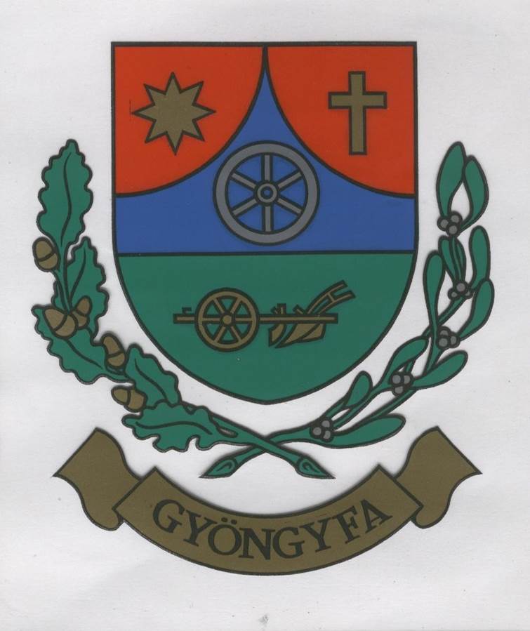 1. § (1) A község címere: Álló, háromszögű pajzs vörös mezejében kékkel és zölddel vágott, ívesen behajló sátor. A kék mezőben lebegő helyzetű, hatküllős ezüst kerék. A zöld mezőben lebegő helyzetű, jobbra fordított arany taligás eke. A jobb felső vörös mezőben arany nyolcágú csillag lebeg, a bal felső vörös mezőben arany latin kereszt lebeg. A címerpajzsot két oldalról alul szárukon keresztbetett arany makkterméssel ékített zöld tölgyfaág és ezüst bogyótermésű zöld fagyöngyág övezik. A címer alatt lebegő, hármas tagolású íves arany szalagon feketével nagybetűs GYÖNGYFA felirat.