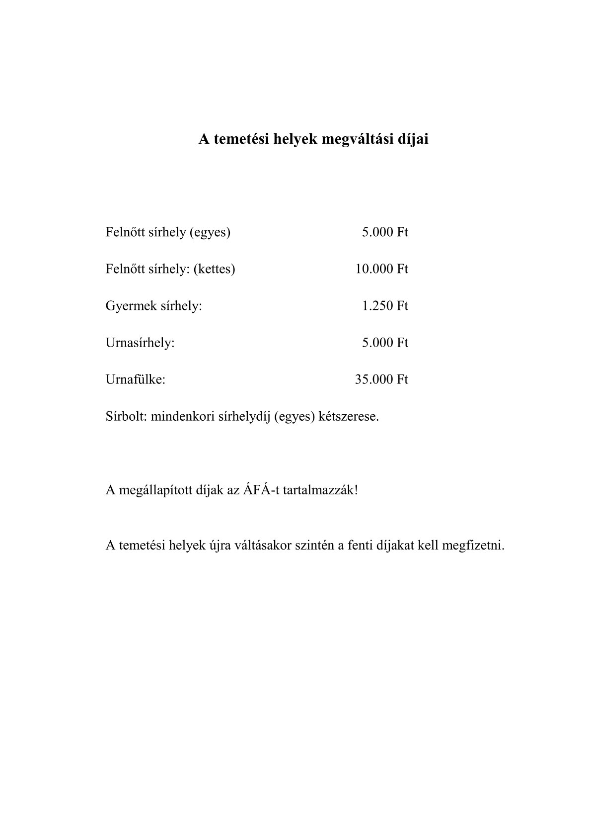 (4) Az egyszeri megváltás meghosszabbítható, melynek időtartama megegyezik az (1) bekezdésben foglaltakkal. A temetési hely díja és az újraváltás díja megegyezik.