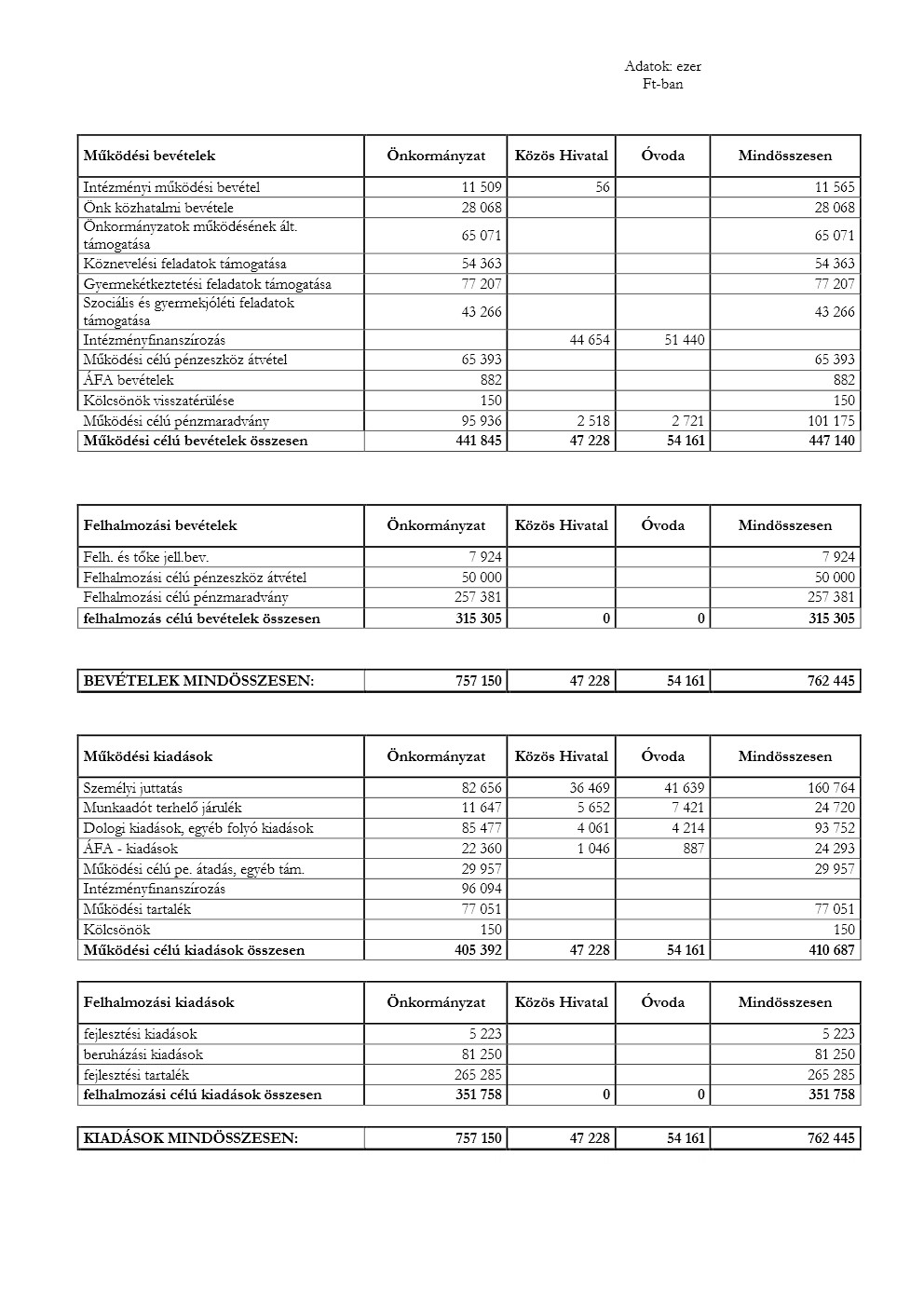 (2) A Képviselő-testület az önkormányzat költségvetésének 2021. évi bevételi és kiadási fő összeget 762.445. ezer (továbbiakban e) Ft-ban állapítja meg. Ezen belül: 447.140. e Ft működési célú bevétellel-, 410.687. e Ft működési célú kiadással-, 315.305. e Ft felhalmozási jellegű bevétellel-; 351.758. e Ft felhalmozási jellegű kiadással állapítja meg.