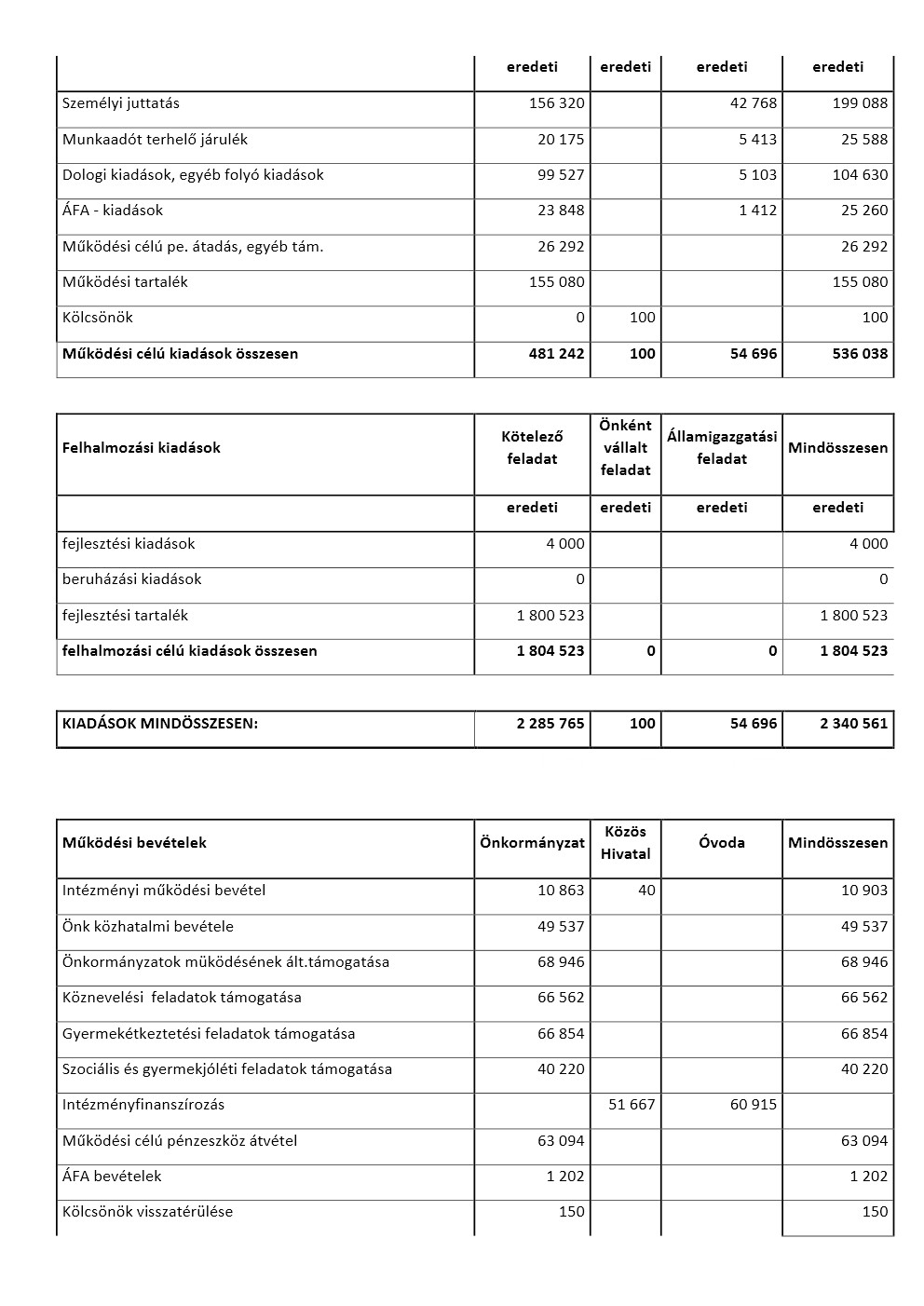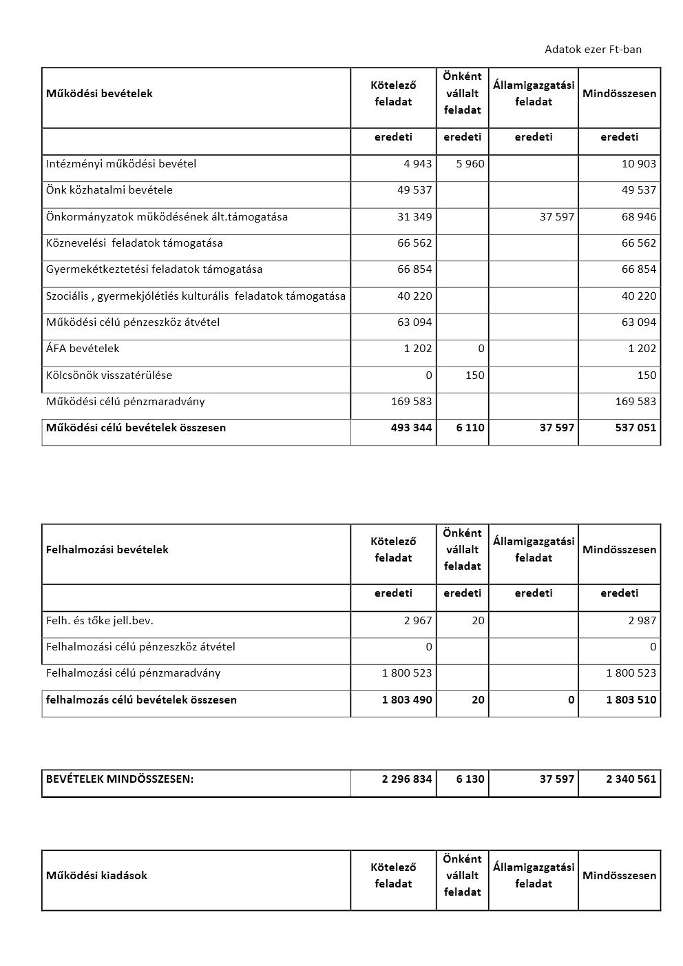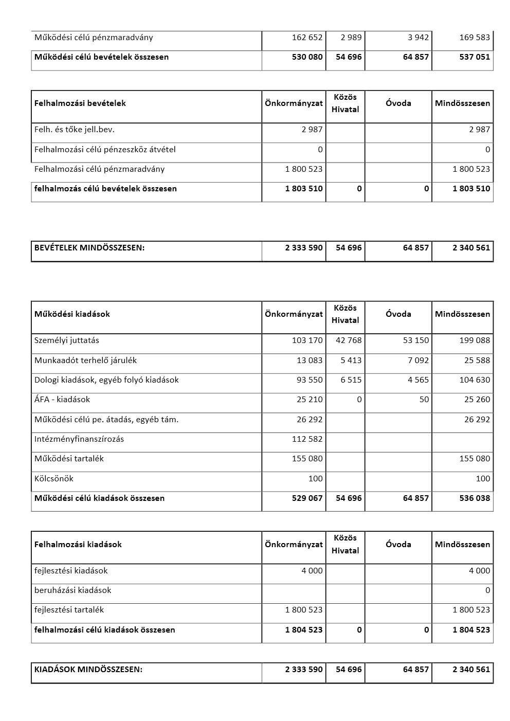 (2) A Képviselő-testület az önkormányzat költségvetésének 2022. évi bevételi és kiadási fő összeget 2.340.561. ezer (továbbiakban: e) Ft-ban állapítja meg. Ezen belül: 537.051. e Ft működési célú bevétellel-, 536.038. e Ft működési célú kiadással-, 1.803.510. e Ft felhalmozási jellegű bevétellel- és 1.804.523. e Ft felhalmozási jellegű kiadással állapítja meg.