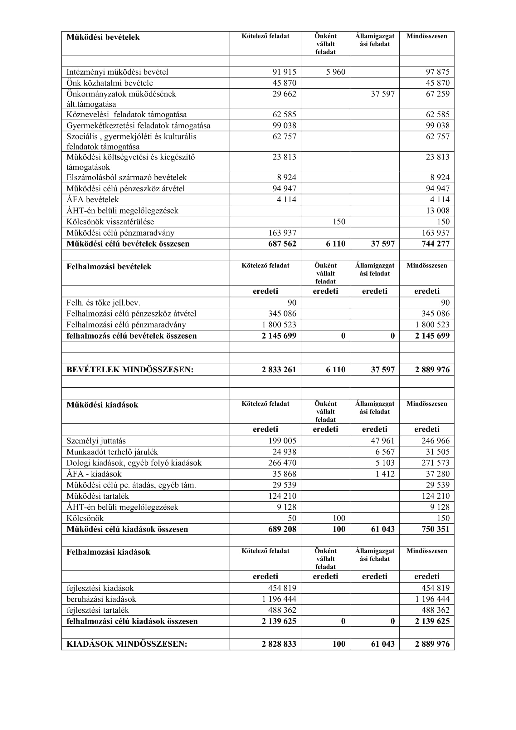 (11) A helyi önkormányzat költségvetési mérlegét önként vállalt és államigazgatási feladat szerinti bontásban a rendelet 15. sz melléklete tartalmazza.