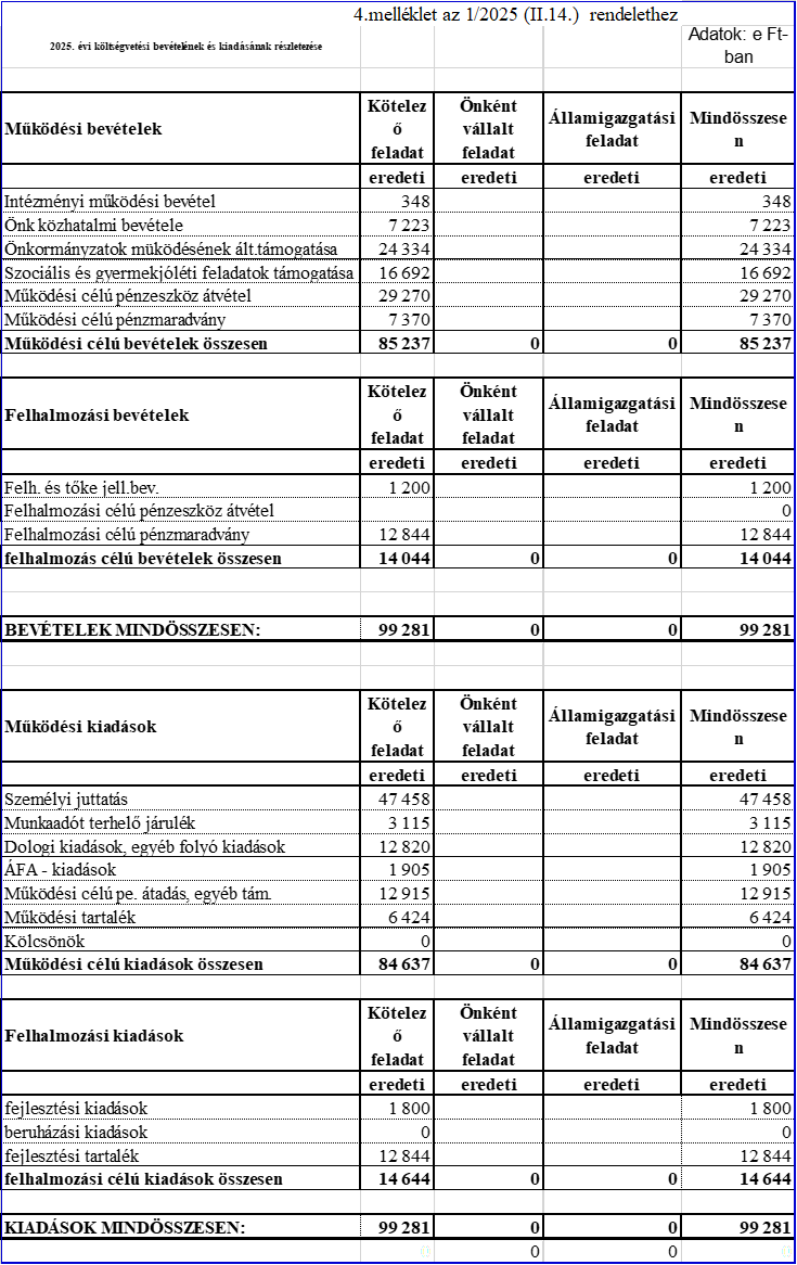 (1) A Képviselő-testület az önkormányzat költségvetésének 2025. évi bevételi és kiadási fő összeget 98 758. e Ft-ban állapítja meg. Ezen belül: