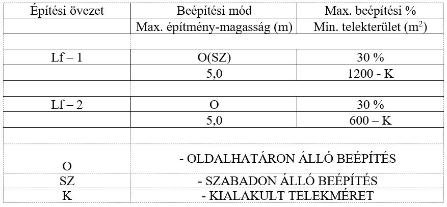 5. § (1)9 Az Lf jelű lakóterületen csak az OTÉK előírásai szerinti építmények helyezhetők el azzal a feltétellel, hogy legfeljebb kétlakásos lakóházak építhetők, üzemanyagtöltő állomás nem helyezhető el. A rendeletben nem szabályozott kérdésekben az OTÉK előírásait kell alkalmazni.