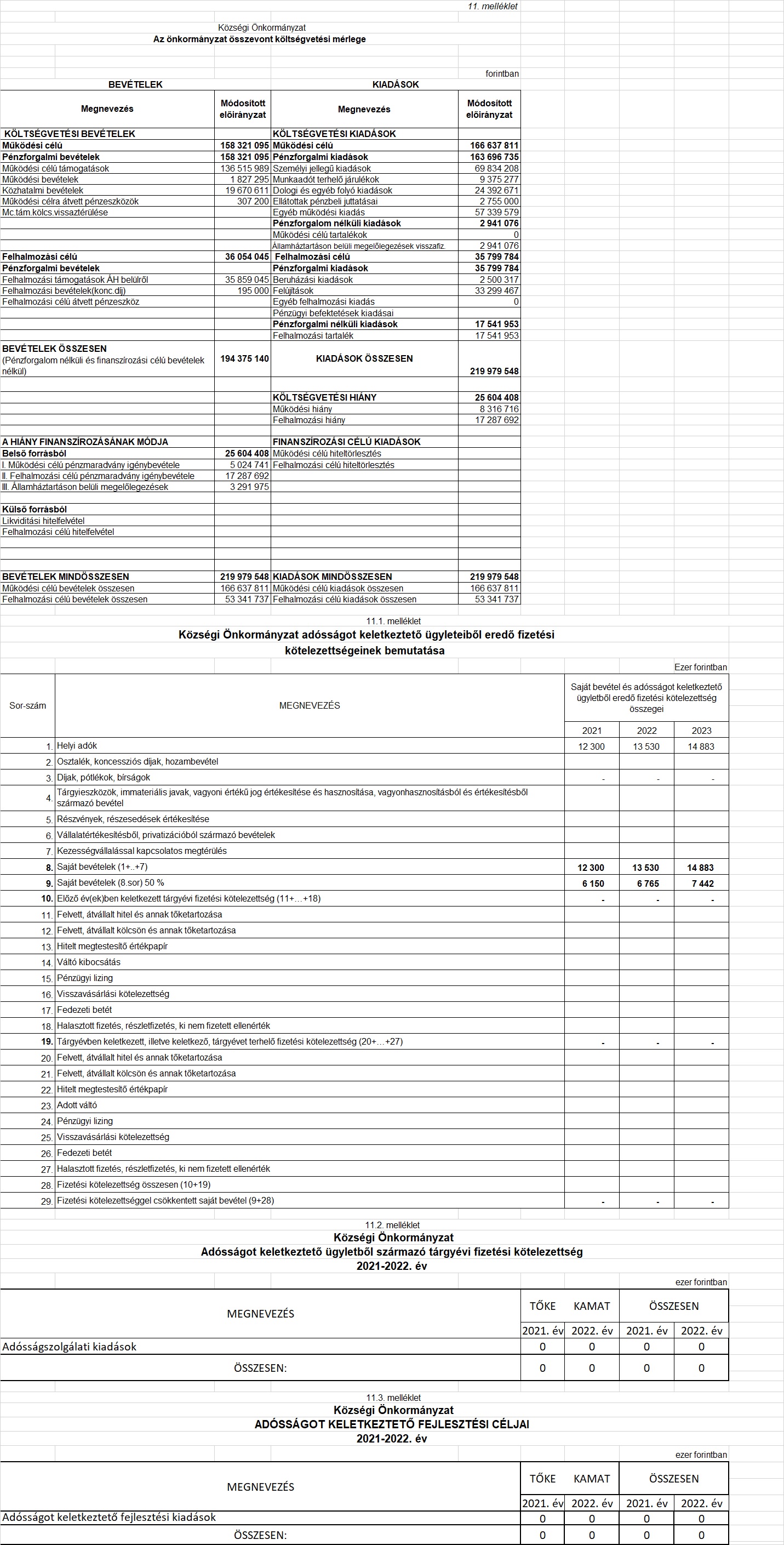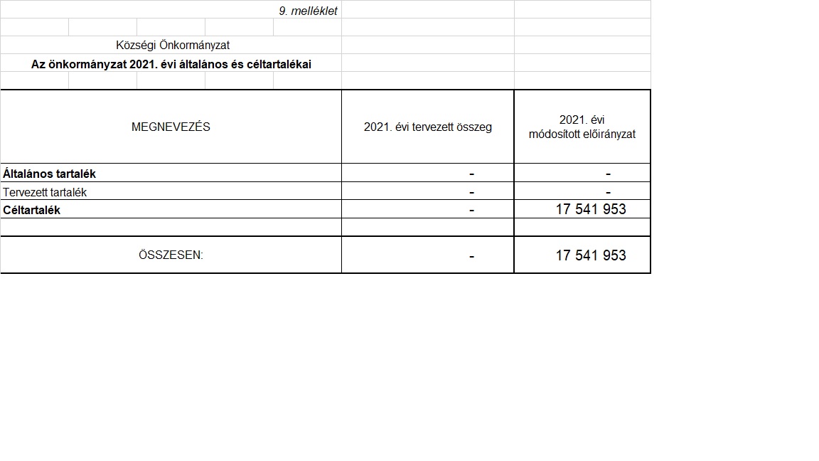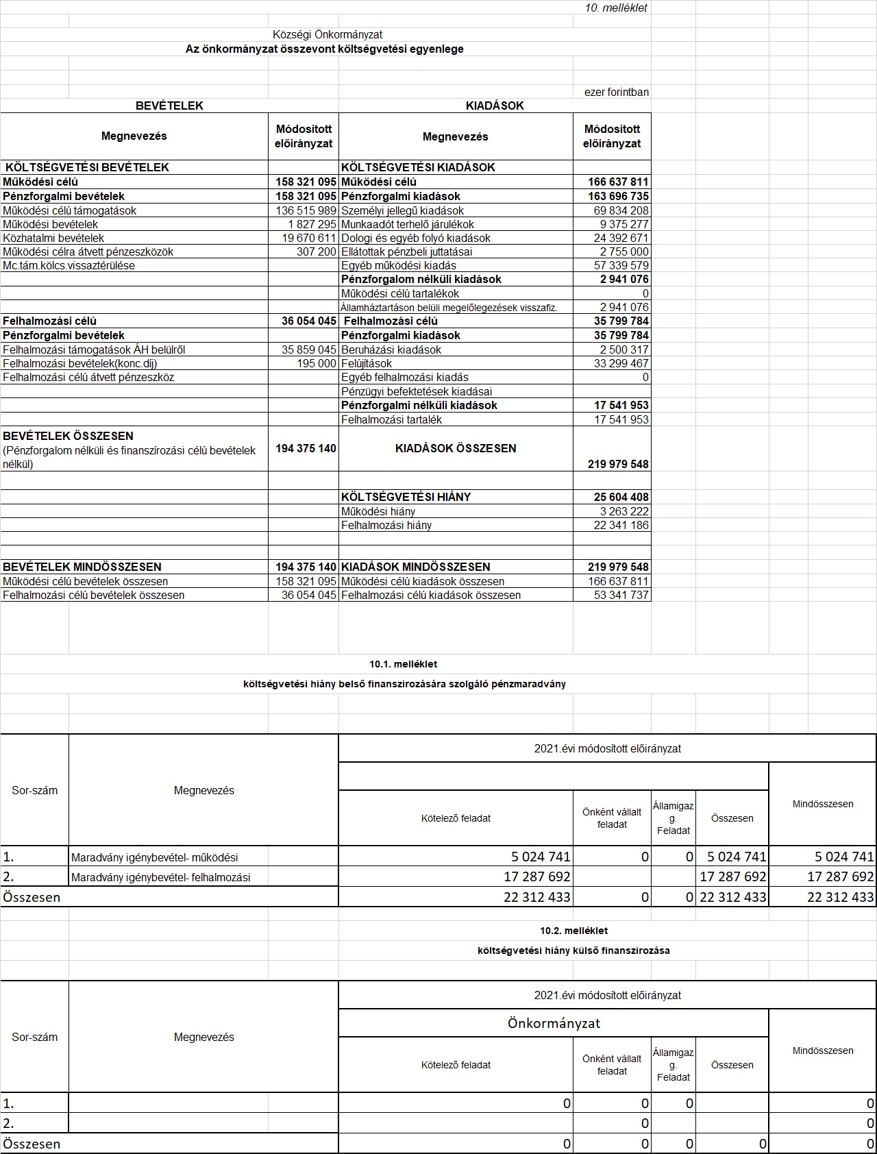 „3. § A képviselőtestület az önkormányzat és költségvetési szerve együttes 2021. évi költségvetését, 219 979 548,- Ft bevétellel, és 219 979 548,- Ft kiadással állapítja meg. Ezen belül a működési célú bevételt 166 637 811,- Ft, működési bevételek 1 827 295,- Ft, közhatalmi bevételek 19 670 611,- Ft, önkormányzatok költségvetési támogatása 88 726 224,- Ft, működési célú támogatásértékű bevételek 45 486 569,- Ft, Működési célú átvett pénzeszköz 307 200,- Ft, előző évi maradvány igénybevétele 5 024 741,- Ft, a működési célú kiadásokat 166 637 811,- Ft, a személyi juttatások kiadásait 69 834 208,- Ft, a munkaadókat terh. jár. és a szoc. hoz. adó 9 375 277,- Ft, dologi kiadás 24 392 671,- Ft, ellátottak pénzbeli juttatásai 2 755 000,- Ft, egyéb működési célú kiadások 57 336 579,- Ft, általános tartalék 0,- Ft, államháztartáson belüli megelőlegezések visszafiz. 2 941 076,- Ft, a felhalmozási célú bevételt 53 341 737,- Ft, előző évi maradvány igénybevétele 17 287 692,- Ft, felhalmozási célú támogatások 35 859 045,-Ft, a felhalmozási célú kiadást 53 341 737,- Ft, beruházási kiadások 2 500 317,- Ft, felújítási kiadások 33 299 467,- Ft, felhalmozási tartalék 17 541 953,- Ft állapítja meg.”