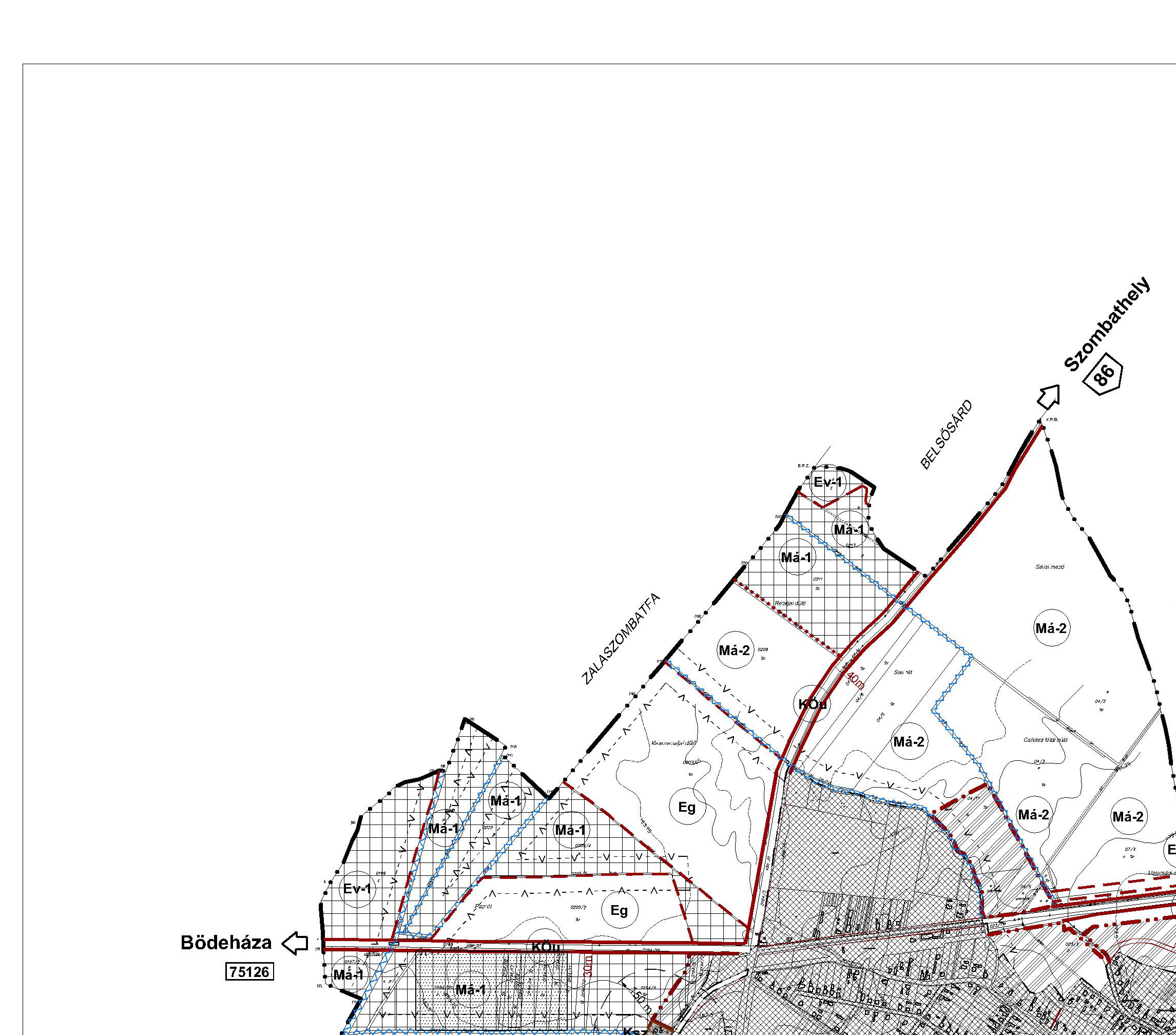 - Országos mellékút: 74126, 75155, 75156 j. bekötő út (meglévő) K.VI.B, B.V.c-C
