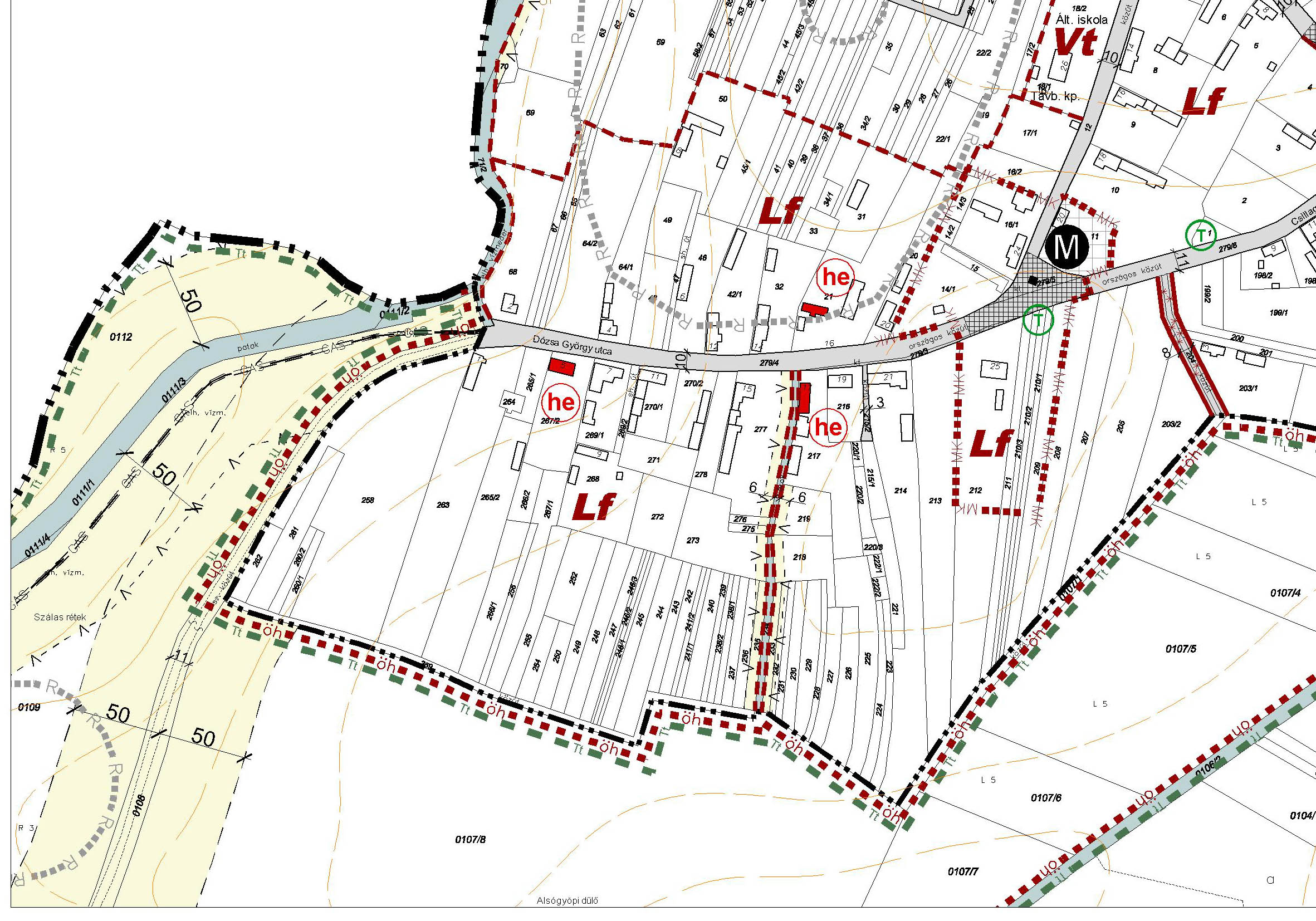 - meglévő és tervezett szabályozási vonal,