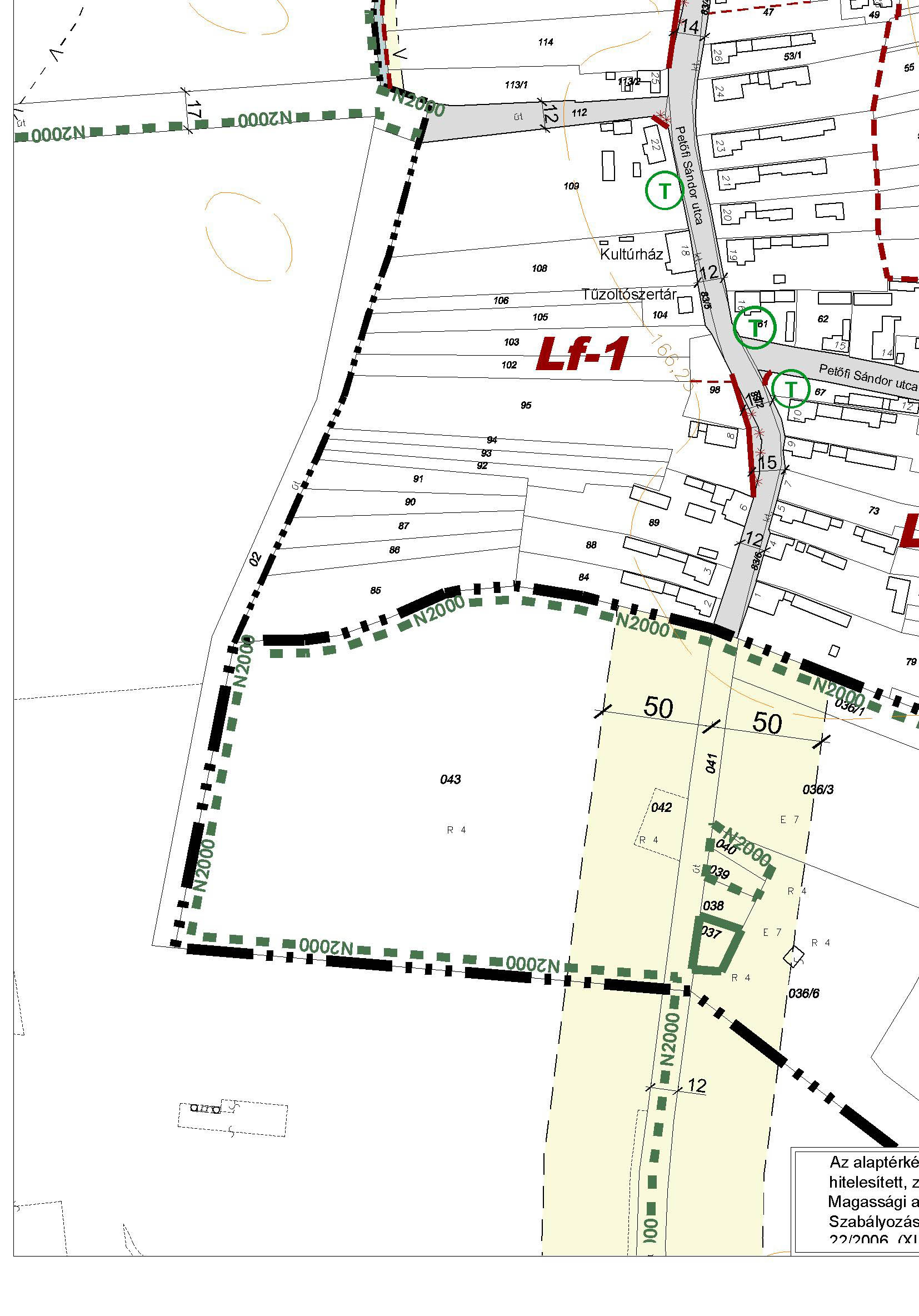 - Beültetési kötelezettség: A telek szabályozási terven jelölt részén telepítendő védő zöld sáv, melyet háromszintű növényzet (gyep, cserje, lombkoronaszint együttesen) ültetésével kell kialakítani. A beültetésű kötelezettségű területen legfeljebb a területet keresztirányban átszelő utak alakíthatók ki. A növénytelepítést a beruházás részeként, az építési tevékenységgel egyidőben kell megvalósítani.