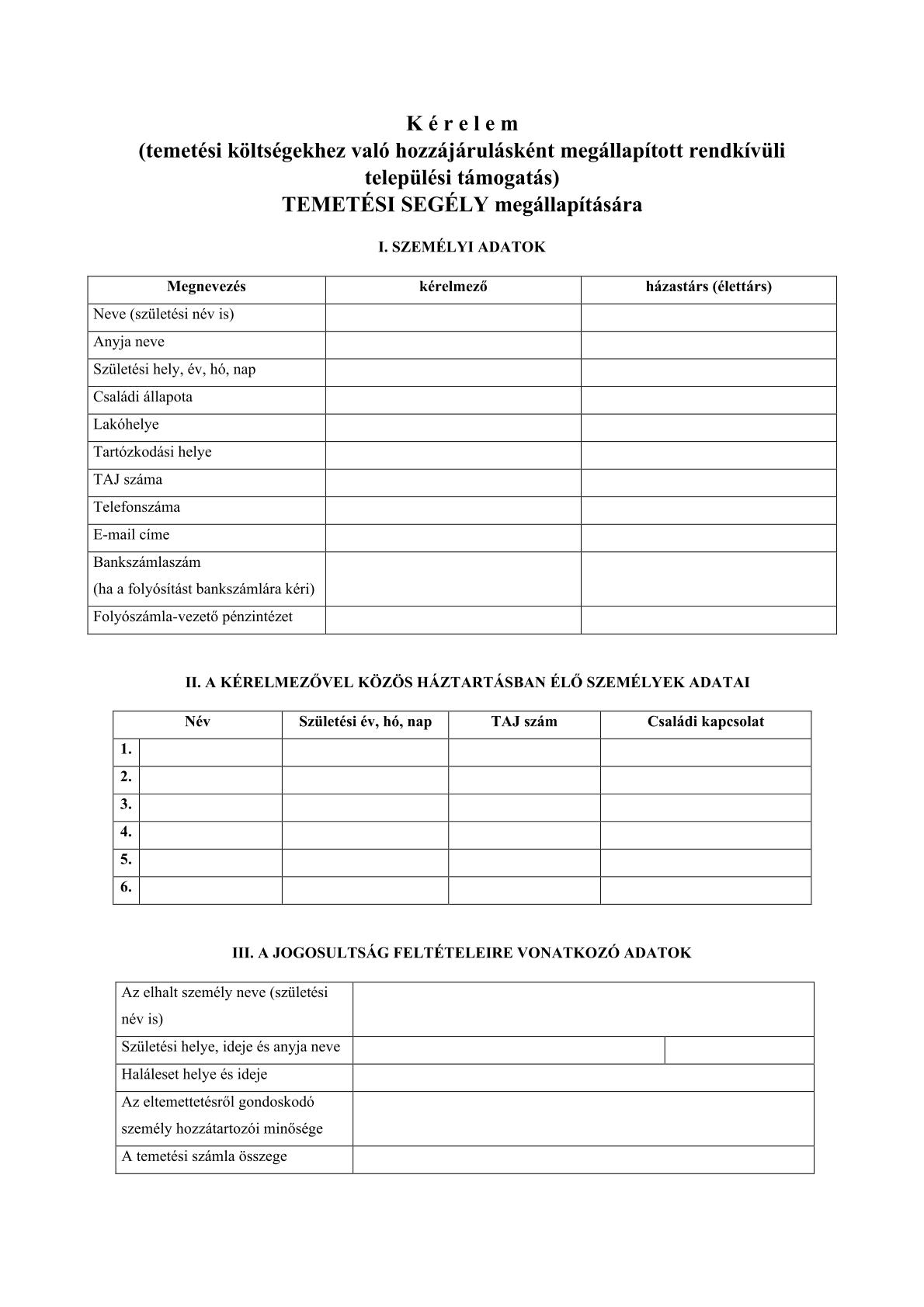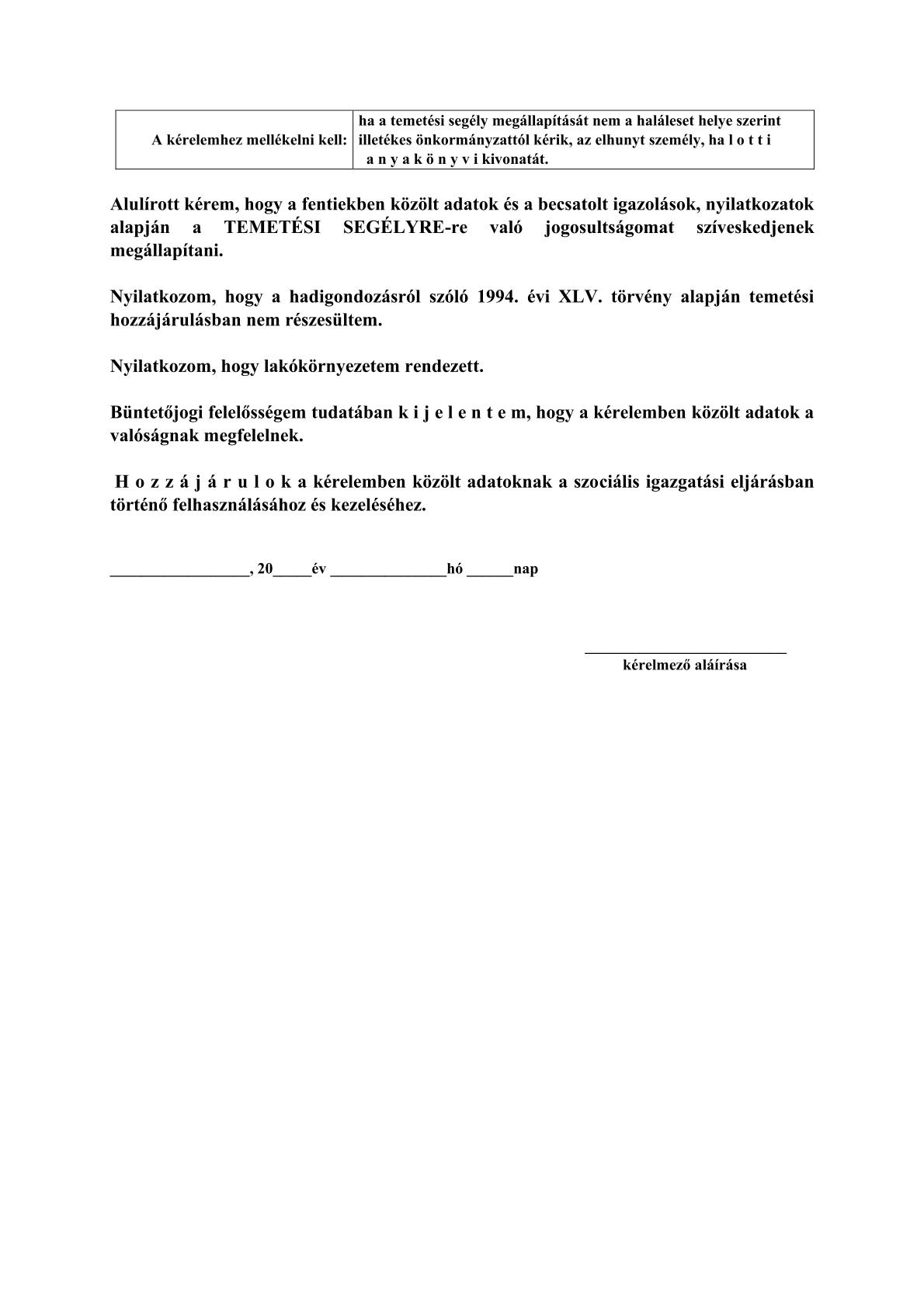 (5) A temetési segély iránti kérelmet e rendelet 5. melléklete szerinti formanyomtatványon kell benyújtani, amelyhez mellékelni kell: e rendelet 1. melléklete szerinti jövedelemnyilatkozatot, illetve a jövedelemnyilatkozatban feltüntetett jövedelmekről – a jövedelem típusának megfelelő – igazolást, vagy azok fénymásolatát.