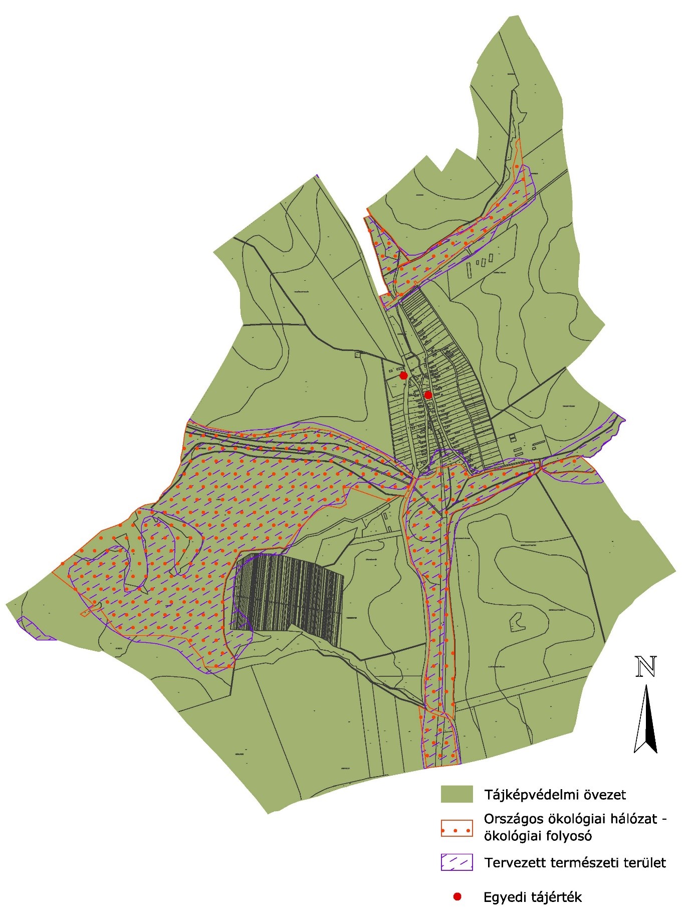 (2) Táj- és természetvédelmi területek: tervezett természeti terület; országos ökológiai hálózat övezete (ökológiai folyosó); tájképvédelmi szempontból kiemelten kezelendő terület övezete; egyedi tájértékek.