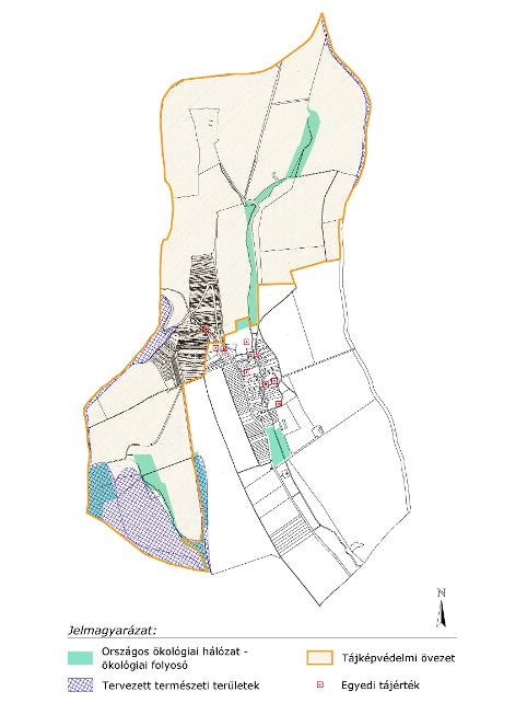 a) Táj- és természetvédelmi területek: országos ökológiai hálózat övezete (ökológiai folyosó), tájképvédelmi szempontból kiemelten kezelendő terület övezete, tervezett természeti terület, egyedi tájértékek.