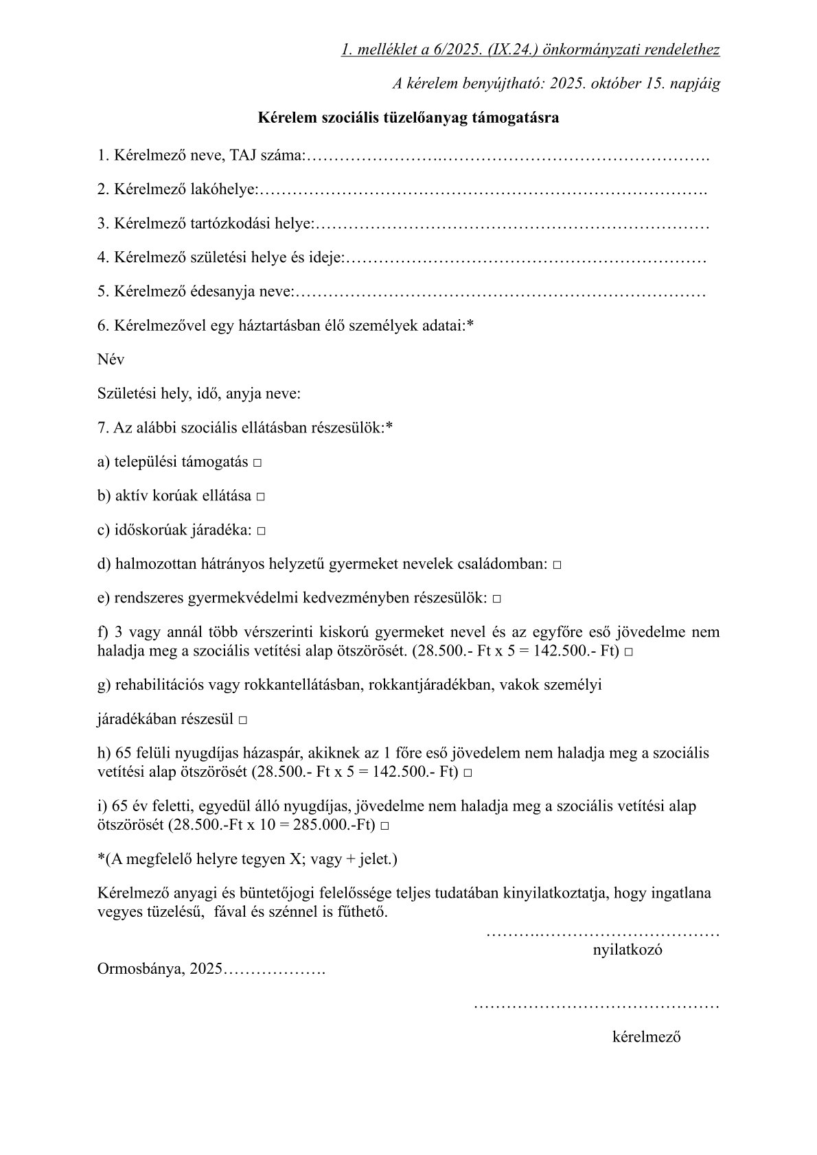(3) Az ellátás iránti kérelmeket 2025. október 15. napjáig lehet benyújtani az Ormosbányai Közös Önkormányzati Hivatalhoz.