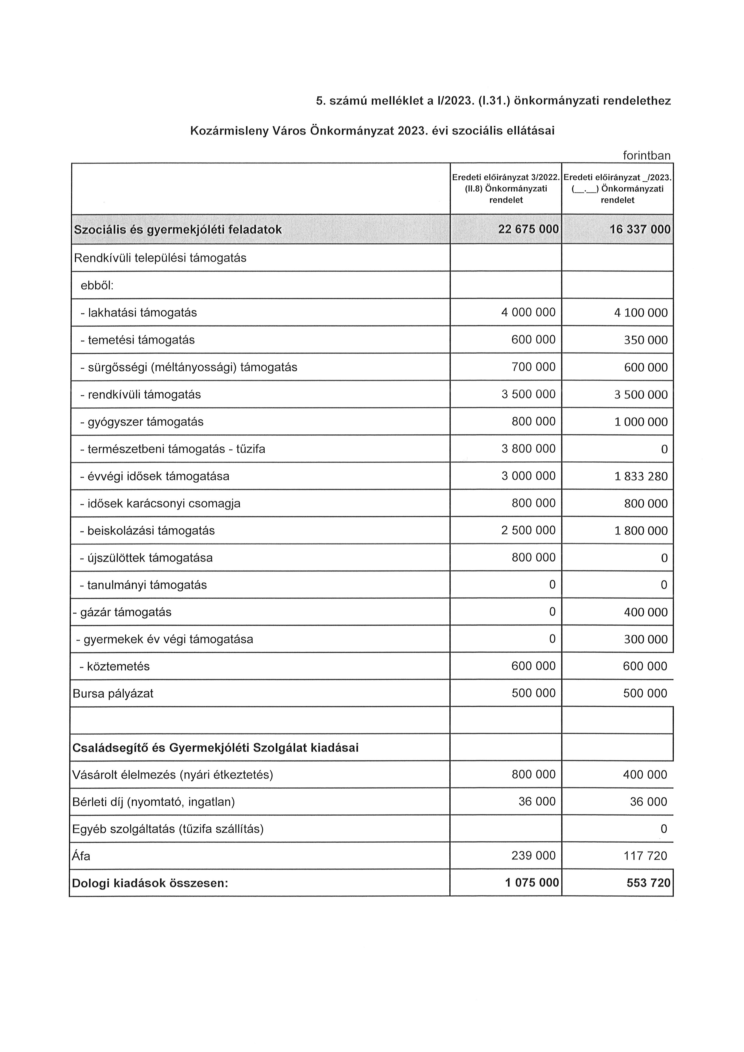 5. melléklet az 1/2023. (I. 31.) önkormányzati rendelethez