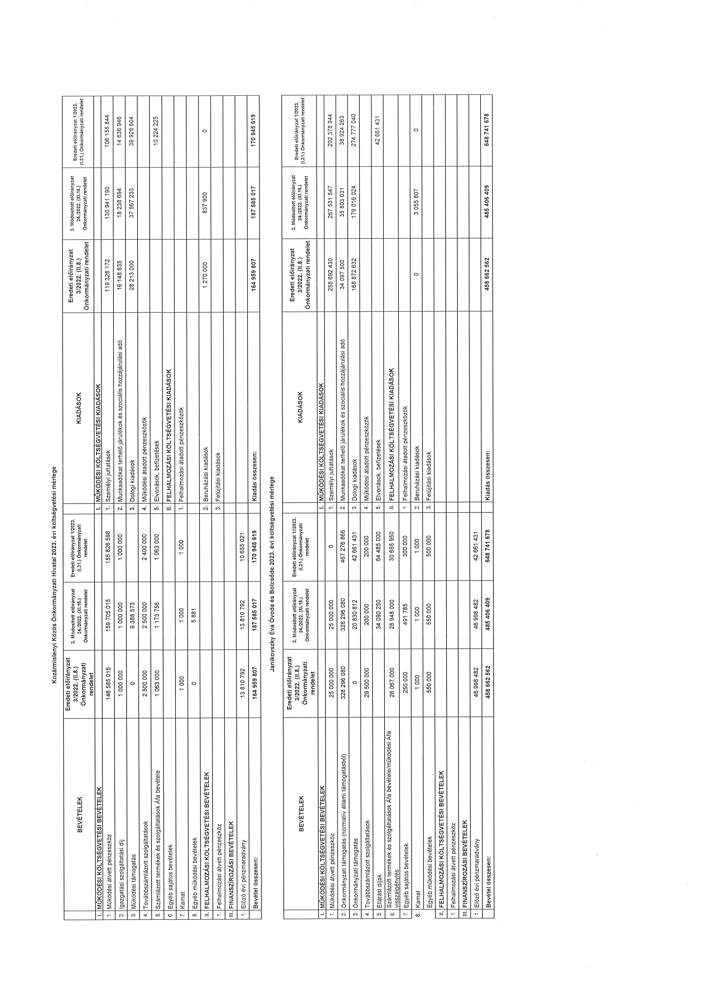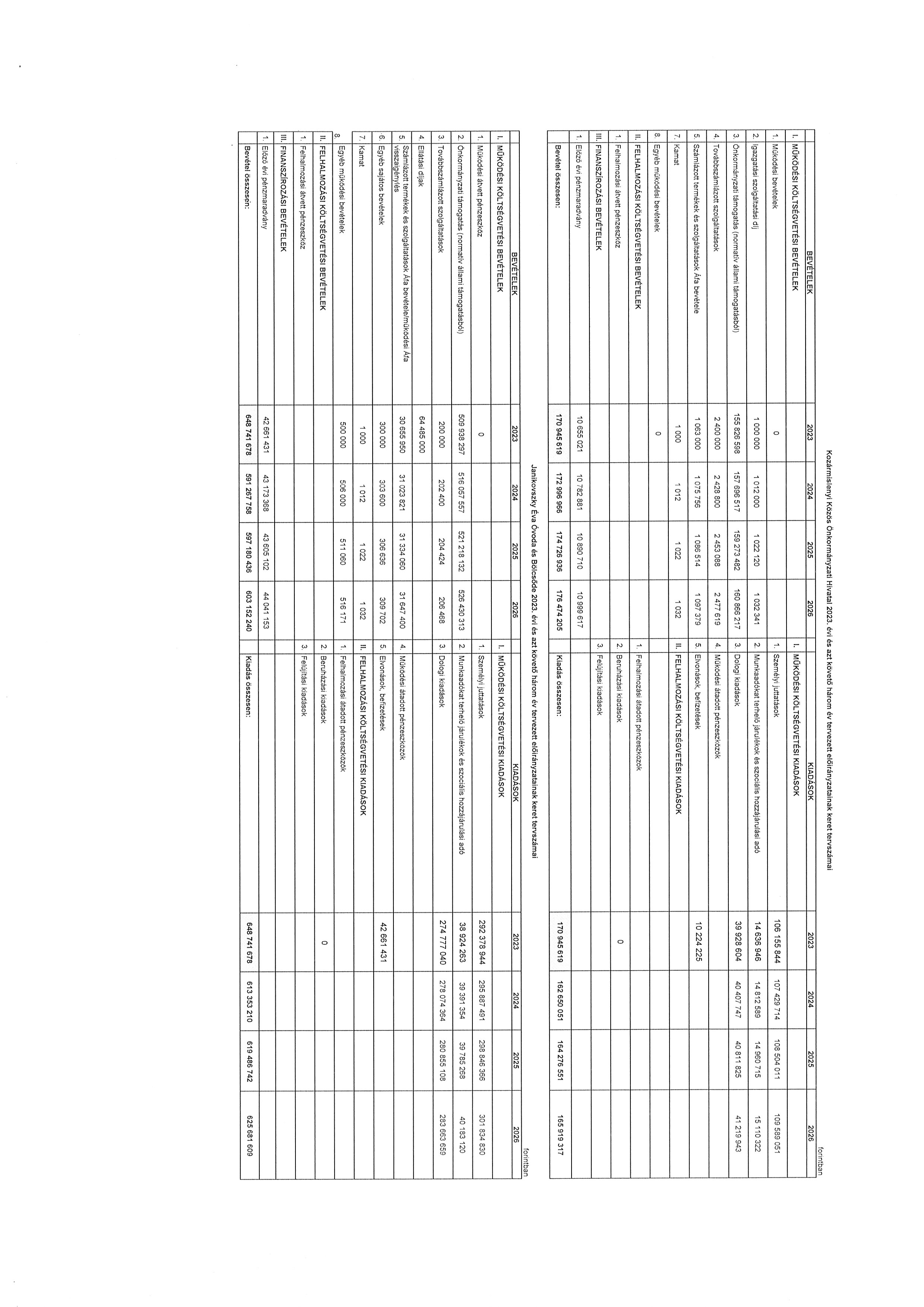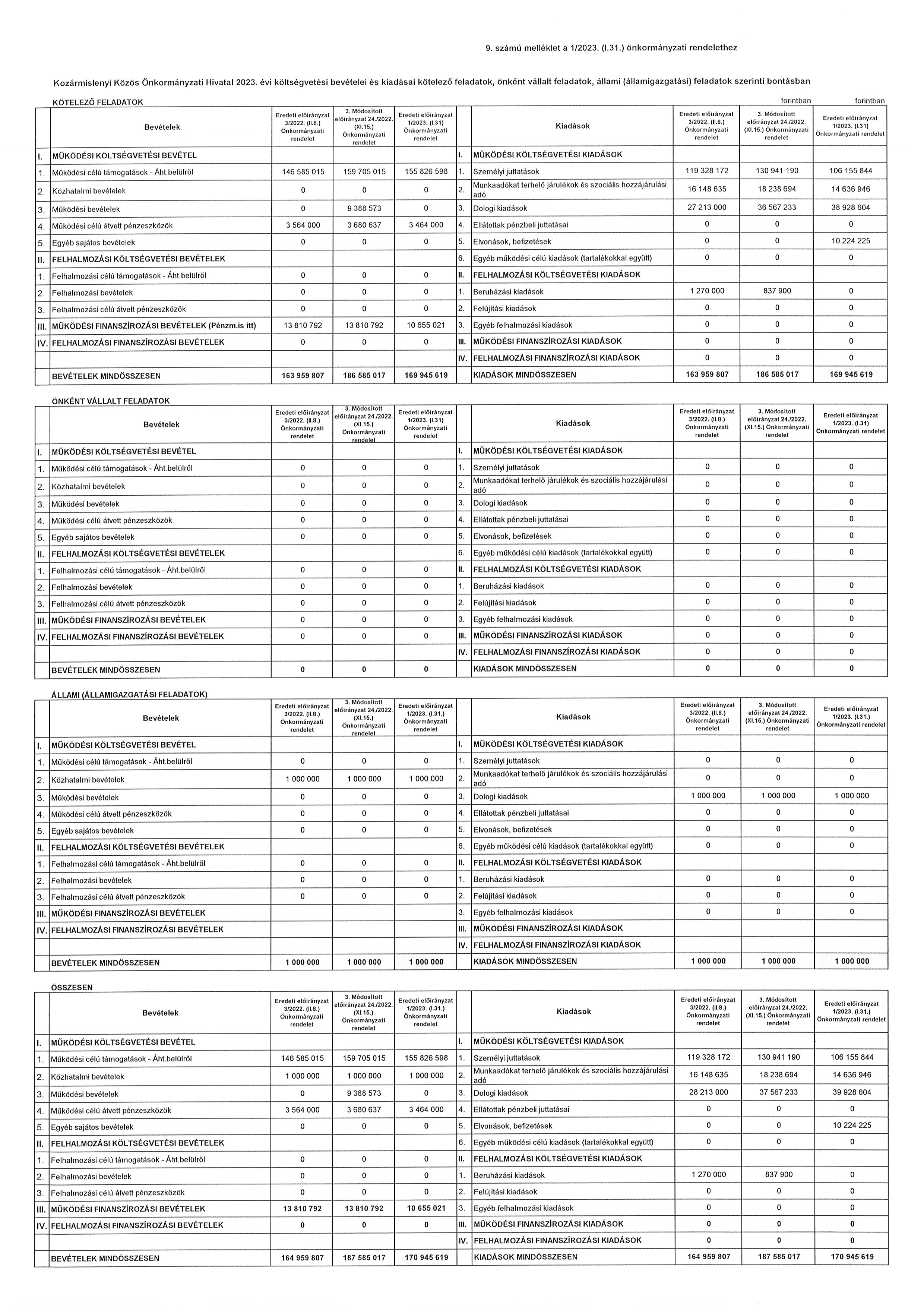 (2) A költségvetési évet követő három év tervezett bevételi előirányzatainak és kiadási előirányzatainak keret tervszámait főbb csoportokban a 11. számú melléklet tartalmazza. Kozármislenyi Közös Önkormányzati Hivatal 2023. évi költségvetési bevételei és kiadásai kötelező feladatainak tervszámait, önként vállalt feladatainak tervszámait, állami (államigazgatási) feladatainak tervszámait a 9. számú melléklet tartalmazza.