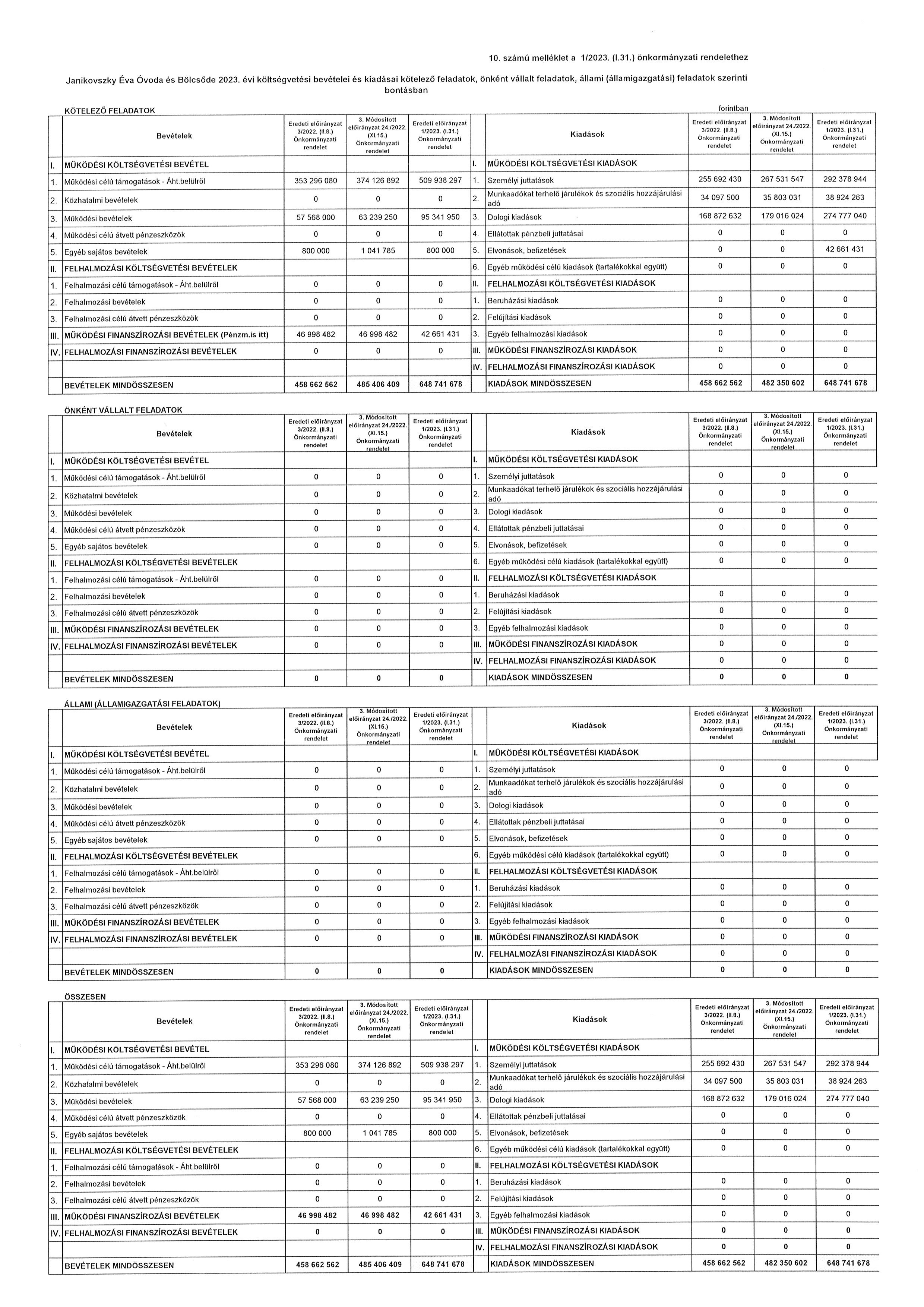 (2) A költségvetési évet követő három év tervezett bevételi előirányzatainak és kiadási előirányzatainak keret tervszámait főbb csoportokban a 11. számú melléklet tartalmazza. Janikovszky Éva Óvoda és Bölcsőde 2023. évi költségvetési bevételei és kiadásai kötelező feladatainak tervszámait, önként vállalt feladatainak tervszámait, állami (államigazgatási) feladatainak tervszámait a 10. számú melléklet tartalmazza.