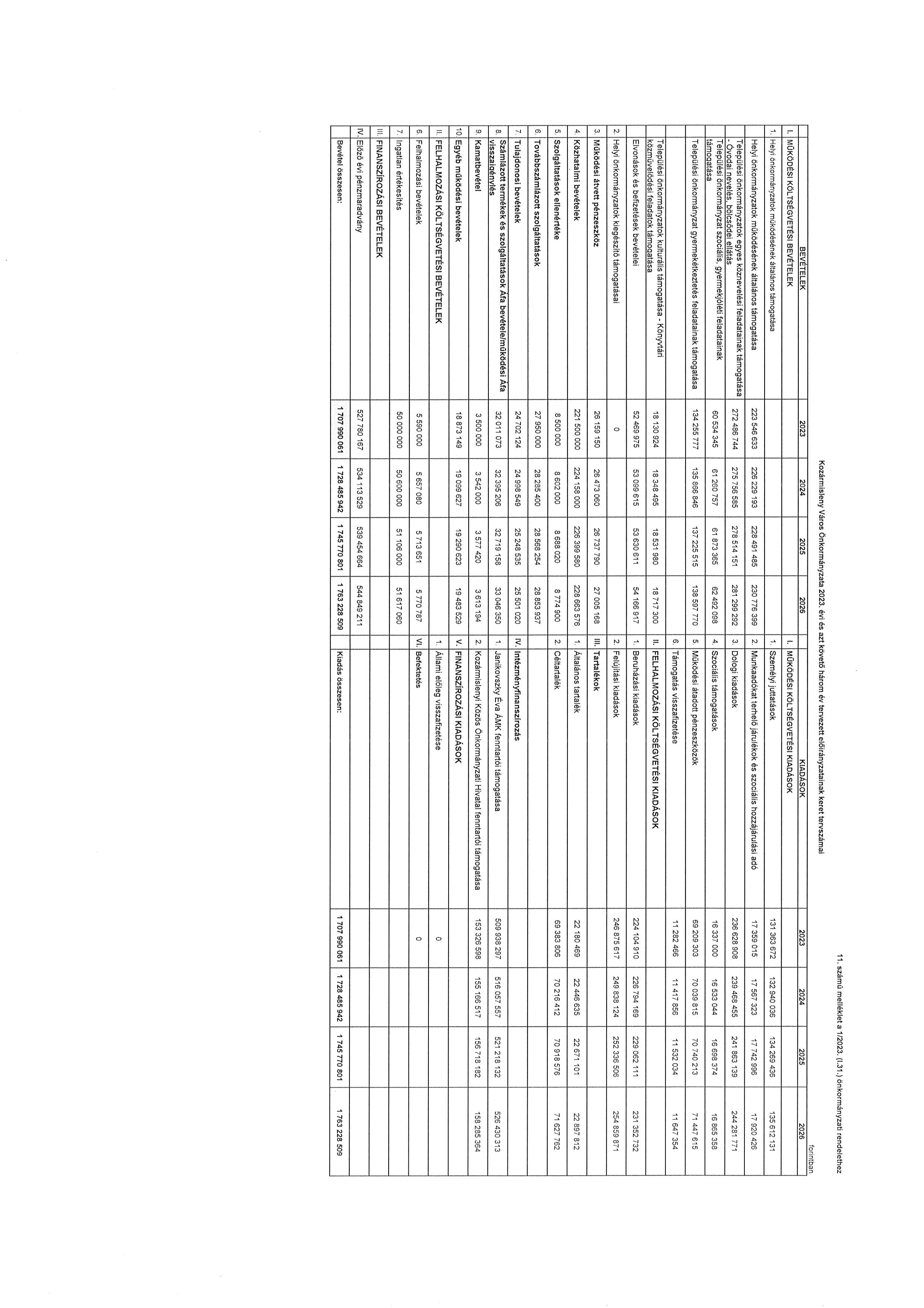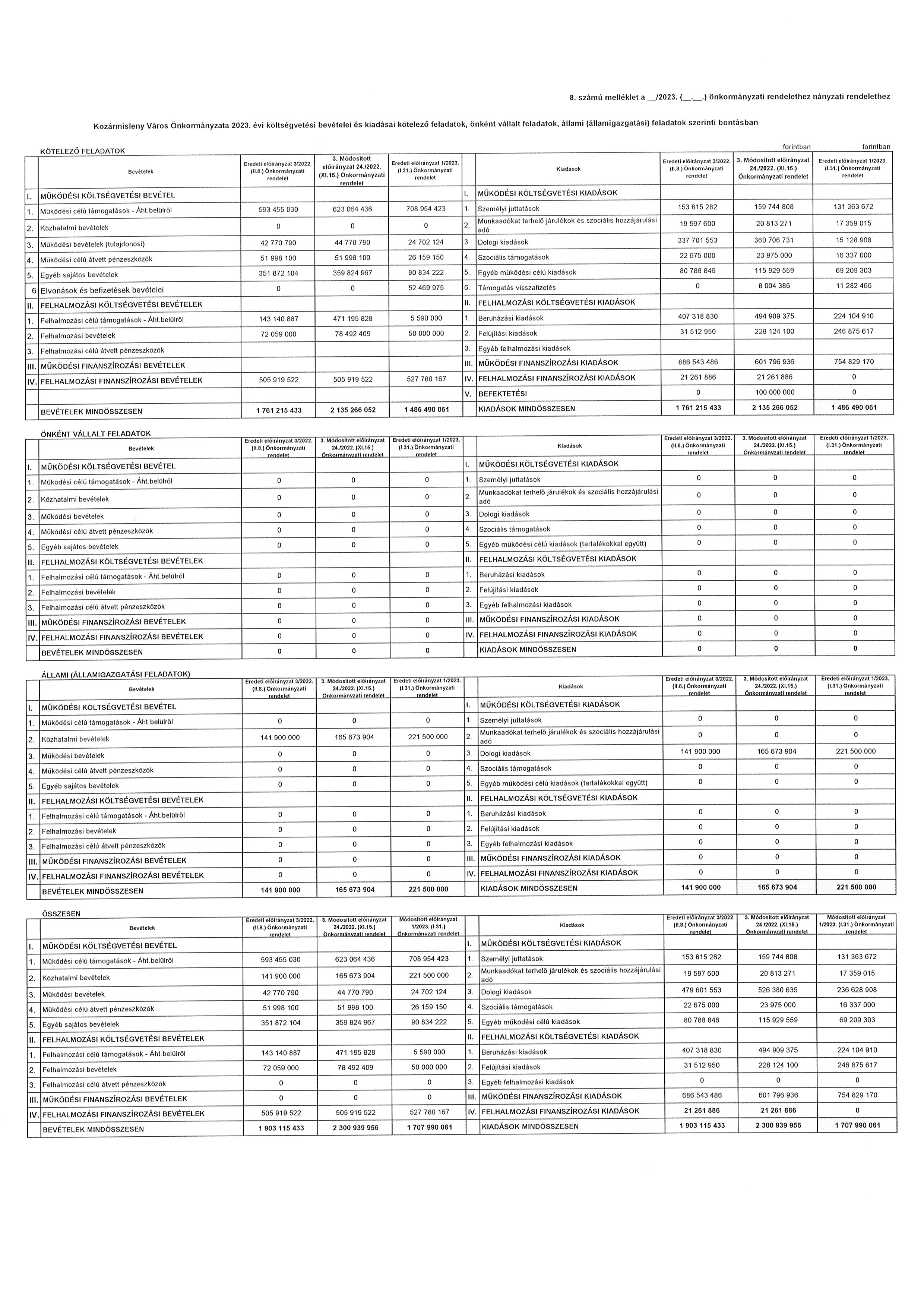 (2) A költségvetési évet követő három év tervezett bevételi előirányzatainak és kiadási előirányzatainak keret tervszámait főbb csoportokban a 11. számú melléklet tartalmazza. Kozármisleny Város Önkormányzata 2023. évi költségvetési bevételei és kiadásai kötelező feladatainak tervszámait, önként vállalt feladatainak tervszámait, állami (államigazgatási) feladatainak tervszámait a 8. számú melléklet tartalmazza.