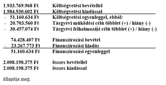 (2) Az (1) bekezdésben megállapított költségvetési bevételek forrásonkénti, a költségvetési kiadások jogcímenkénti megoszlását önkormányzati szinten, továbbá a finanszírozási bevételeket és kiadásokat a rendelet 1. melléklet alapján határozza meg a képviselő-testület.