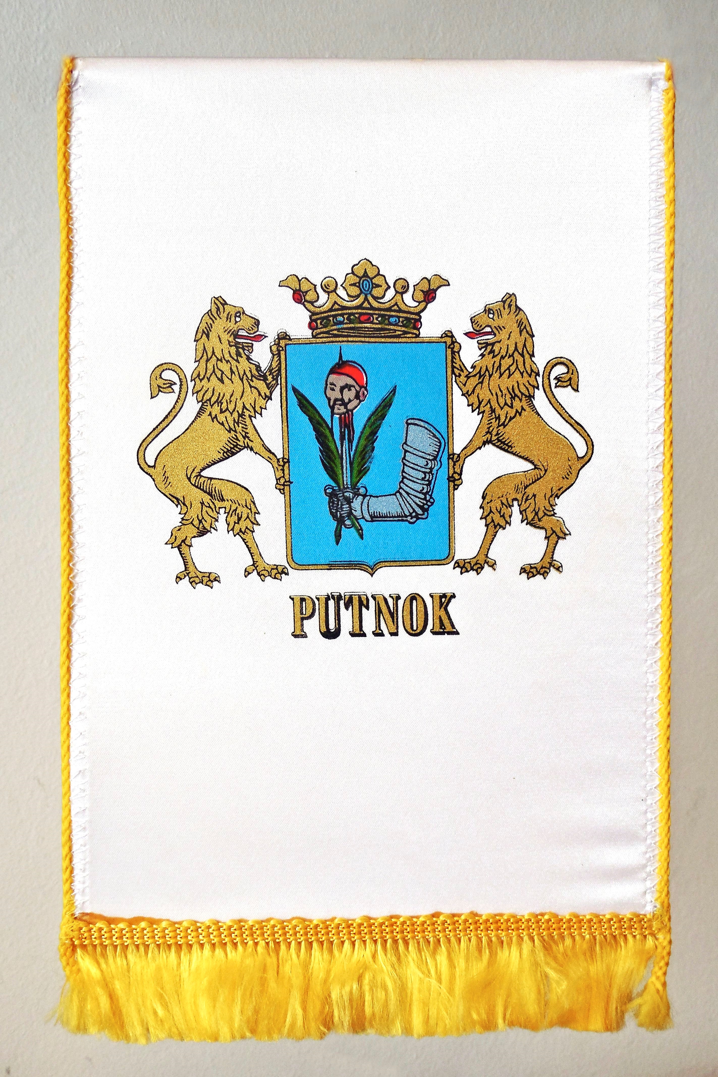 P U T N O K lobogója fehér alapszínű, arany rojtozással, közepén a város címere, alatta a pajzs alsó szélével párhuzamosan írt arany „PUTNOK” felirat.