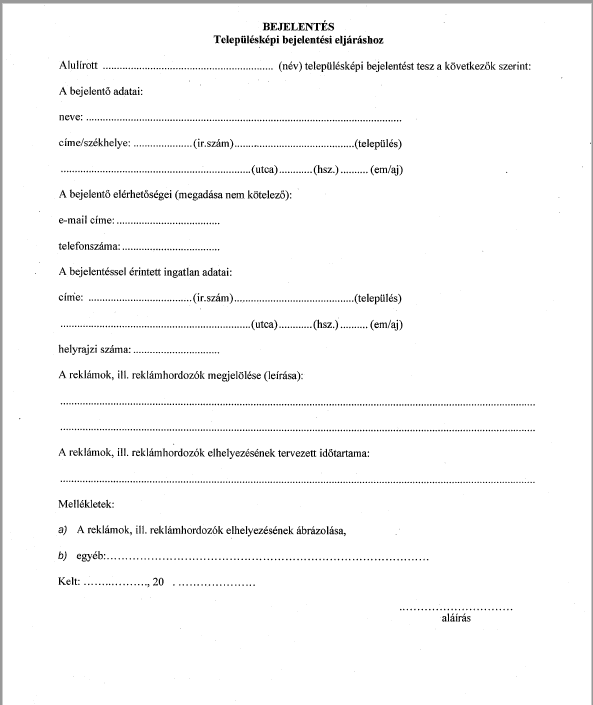 26. § (1) A polgármester településképi bejelentési eljárást folytat le a jelen rendeletben foglalt reklám és reklámhordozó elhelyezési követelmények tekintetében a reklámok és reklámhordozók elhelyezését megelőzően.