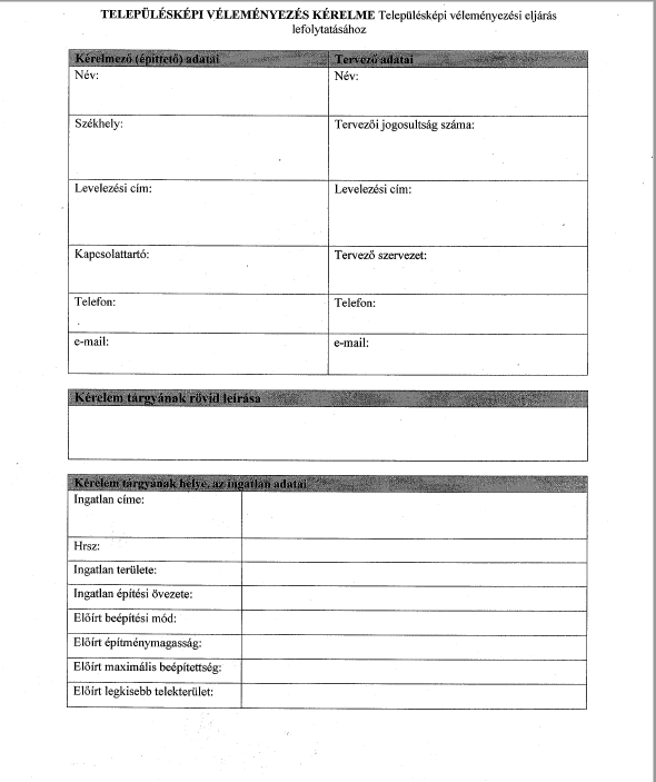 25. § (1) A településképi véleményezési eljárás megindításához a kérelmező (építtető) a 3. sz. melléklet szerinti kérelmet kitölti és papír alapon nyújtja be a polgármesternek címezve, továbbá a véleményezendő építészeti-műszaki dokumentációt elektronikus formában az építésügyi hatósági eljáráshoz biztosított elektronikus tárhelyre hiánytalanul feltölti, melyhez a polgármesternek hozzáférést biztosít.
