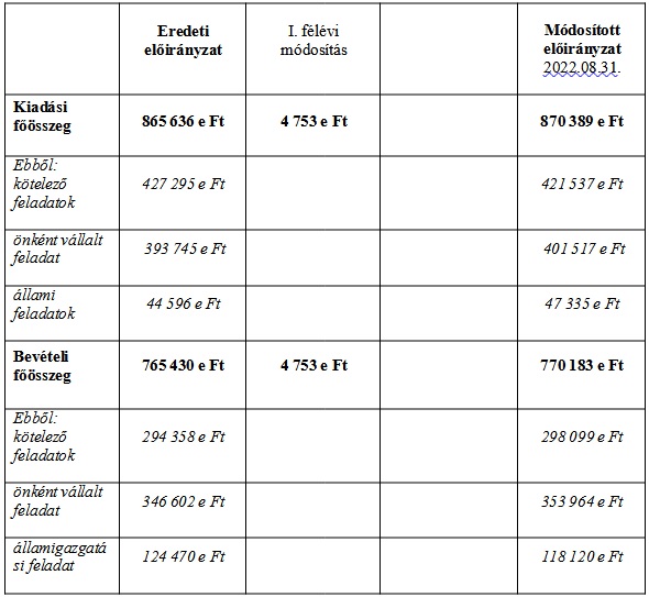 1. § (1) A képviselő-testület a 2022. évi költségvetésről szóló 2/2022. (III.01.) önkormányzati rendelet (továbbiakban: Rendelet) 1. § (1) bekezdése helyébe az alábbi rendelkezés lép: A 2022 . évi költségvetésének előirányzatait az alábbiak szerint állapítja meg: