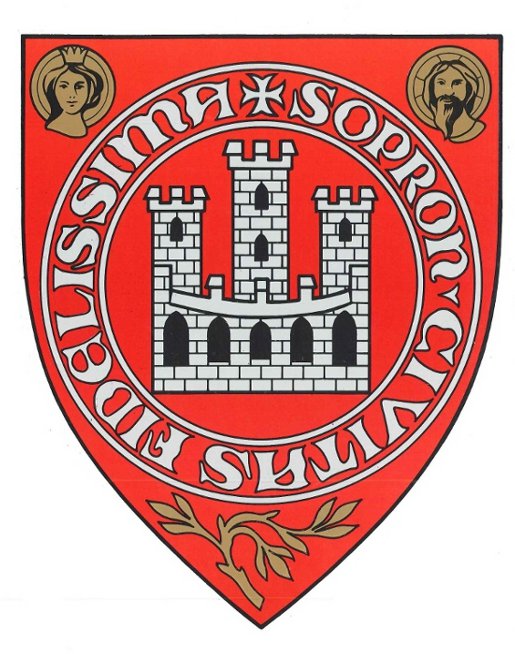 (2) Sopron Megyei Jogú Város címere: hegyes talpú, vörös címerpajzs ezüstszínű máltai kereszttel elválasztott „SOPRON CIVITAS FIDELISSIMA” körirattal. A címerpajzson ezüstszínű ötormú várfal látható, öt csúcsíves ablakkal, a várfalból három torony emelkedik ki a két szélső torony egy-egy ablakkal és három orommal, a középső magasabb torony két ablakkal és három orommal. A pajzs felső sarkaiban aranyszínű kör alapon, dicsfénnyel övezve balról koronás női fej, jobbról szakállas férfifej látható, a háttérben kereszttel. A pajzstalpban aranyszínű olajág. A címer képe jelen rendelet 3. mellékletét képezi.
