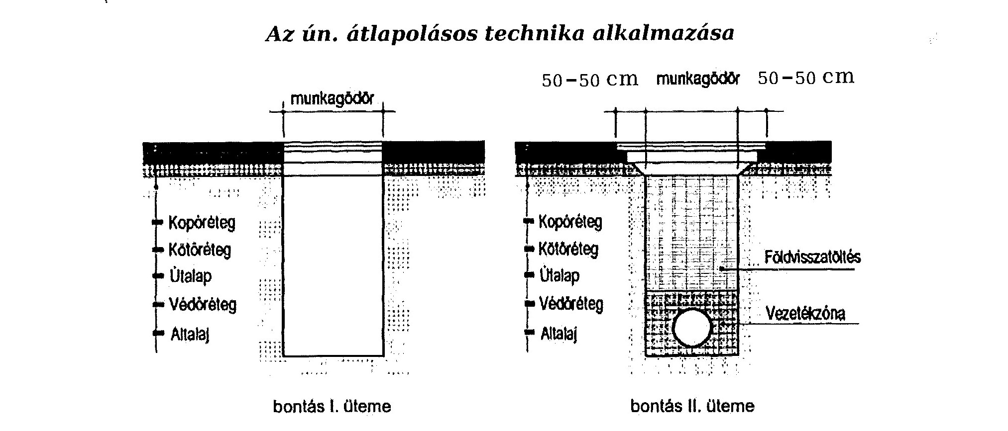 (2) A bontás a nyitandó árok vagy munkagödör szélességi méretével azonos szélességben történhet. Az árokkiemelés, közműépítés, földvisszatöltés után a burkolaton további bontást kell végezni azért, hogy a munkaárok, a burkolatalap és az aszfaltburkolat munkahézaga ne essen egy keresztmetszetbe. E célból az ún. átlapolásos technikát kell alkalmazni, vagyis az aszfaltburkolaton, szükség esetén a burkolatalapon is 50-50 cm szélességű további bontást kell végezni a munkaárok mindkét oldalán a rétegek számától függően, hogy a függőleges hézagok vízszintes eltolása biztosított legyen (3. melléklet).