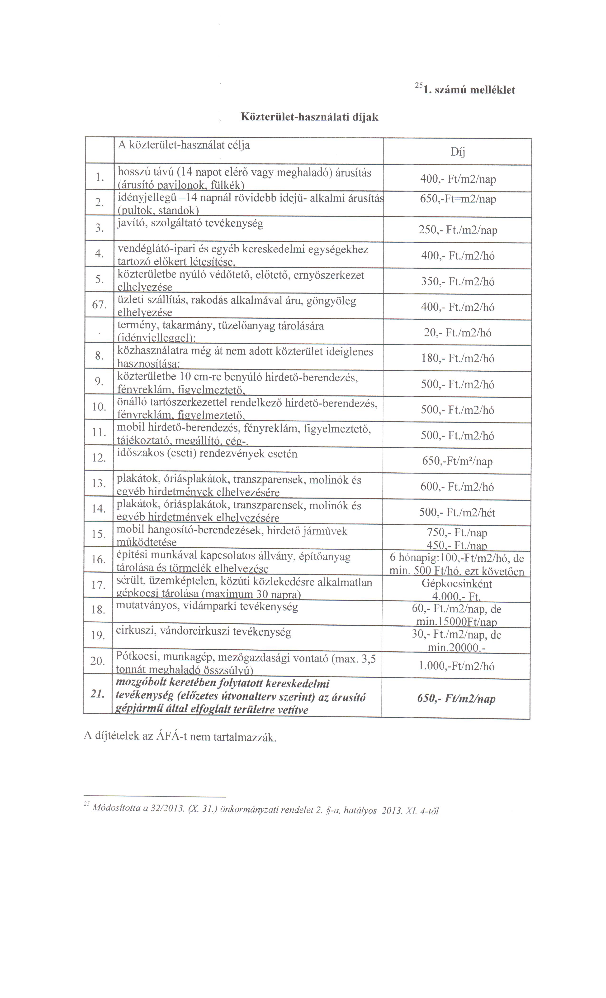 1. | hosszú távú (14 napot elérő vagy meghaladó) árusítás (árusító pavilonok, fülkék) | 400,- Ft/m2/nap |