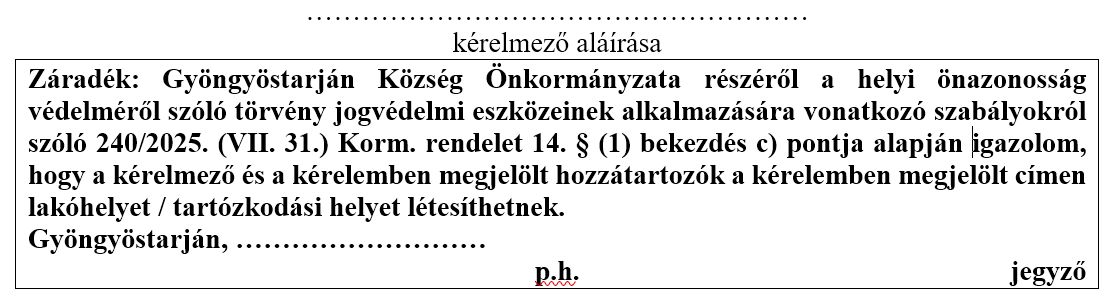 1. § (1) A helyi önazonosság védelméről szóló 2025. évi XLVIII. törvény (továbbiakban: Hövtv.) 6. § (1) bekezdés szerinti mentességeket a jegyző a helyi önazonosság védelméről szóló törvény jogvédelmi eszközeinek alkalmazására vonatkozó szabályokról szóló 240/2025. (VII. 31.) Korm. rendelet 14. § (1) bekezdés c) pontja szerinti lakcímbejelentési eljáráshoz egyszerűsített eljárásban, a kérelem záradékolásával igazolja.