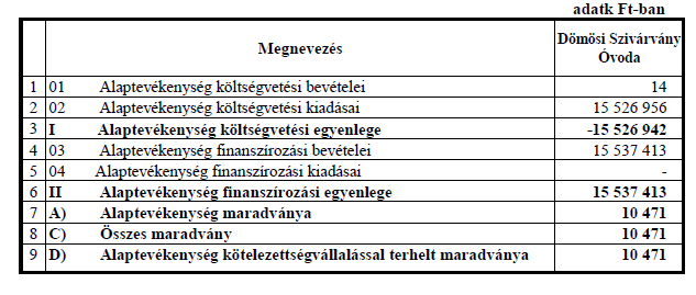 10. § A Dömösi Szivárvány Óvoda költségvetési bevételeit és költségvetési kiadásait előirányzat-csoportok, kiemelt előirányzatok, valamint kötelezően ellátott, önként vállalt és államigazgatási feladatok szerinti bontásban a 11-12. melléklet tartalmazza.