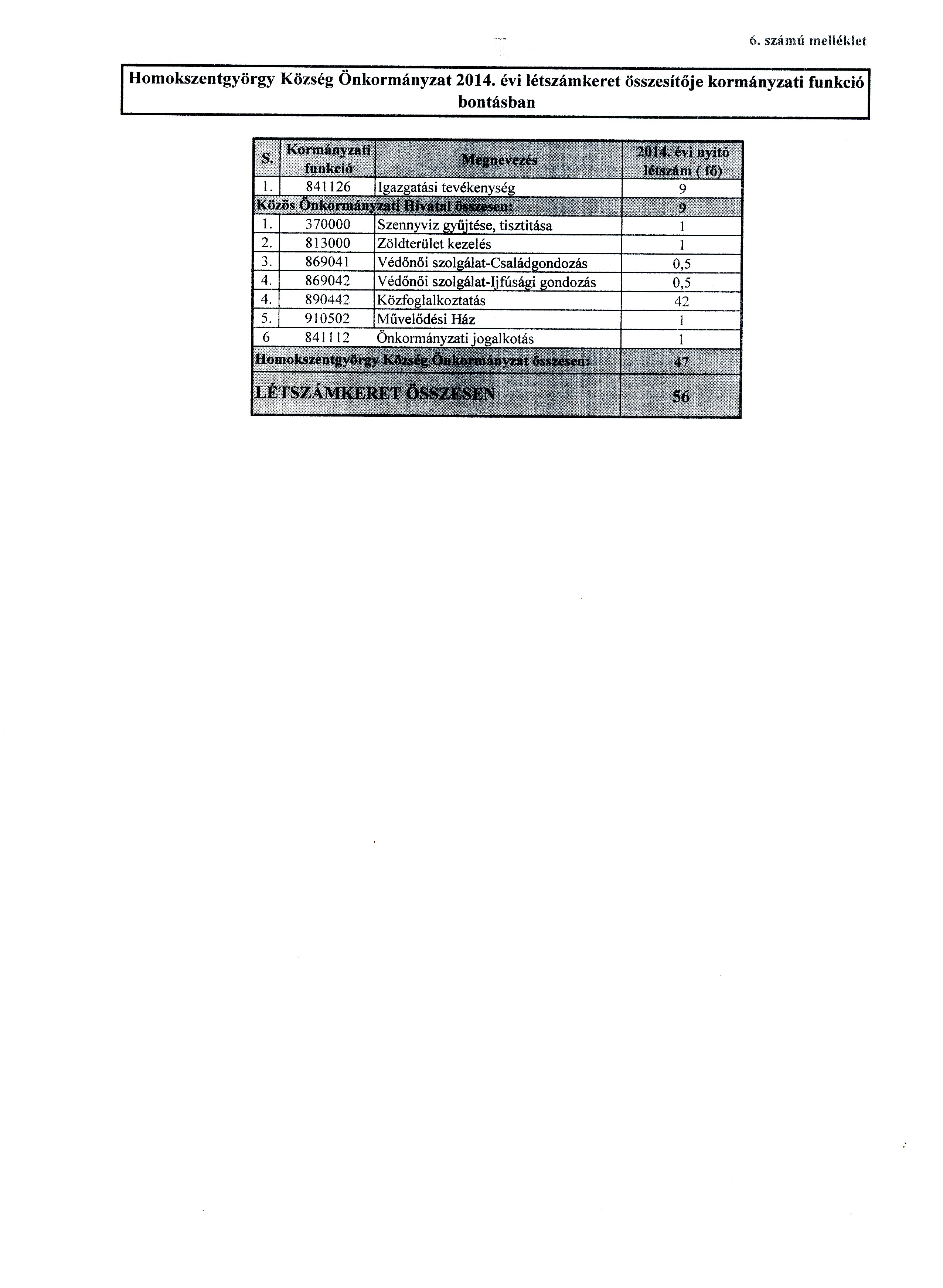 6. § (1) A képviselő-testület az önkormányzat 2014. évre összesített – közfoglalkoztatottak nélküli – létszám-előirányzatát az alábbiak szerint állapítja meg