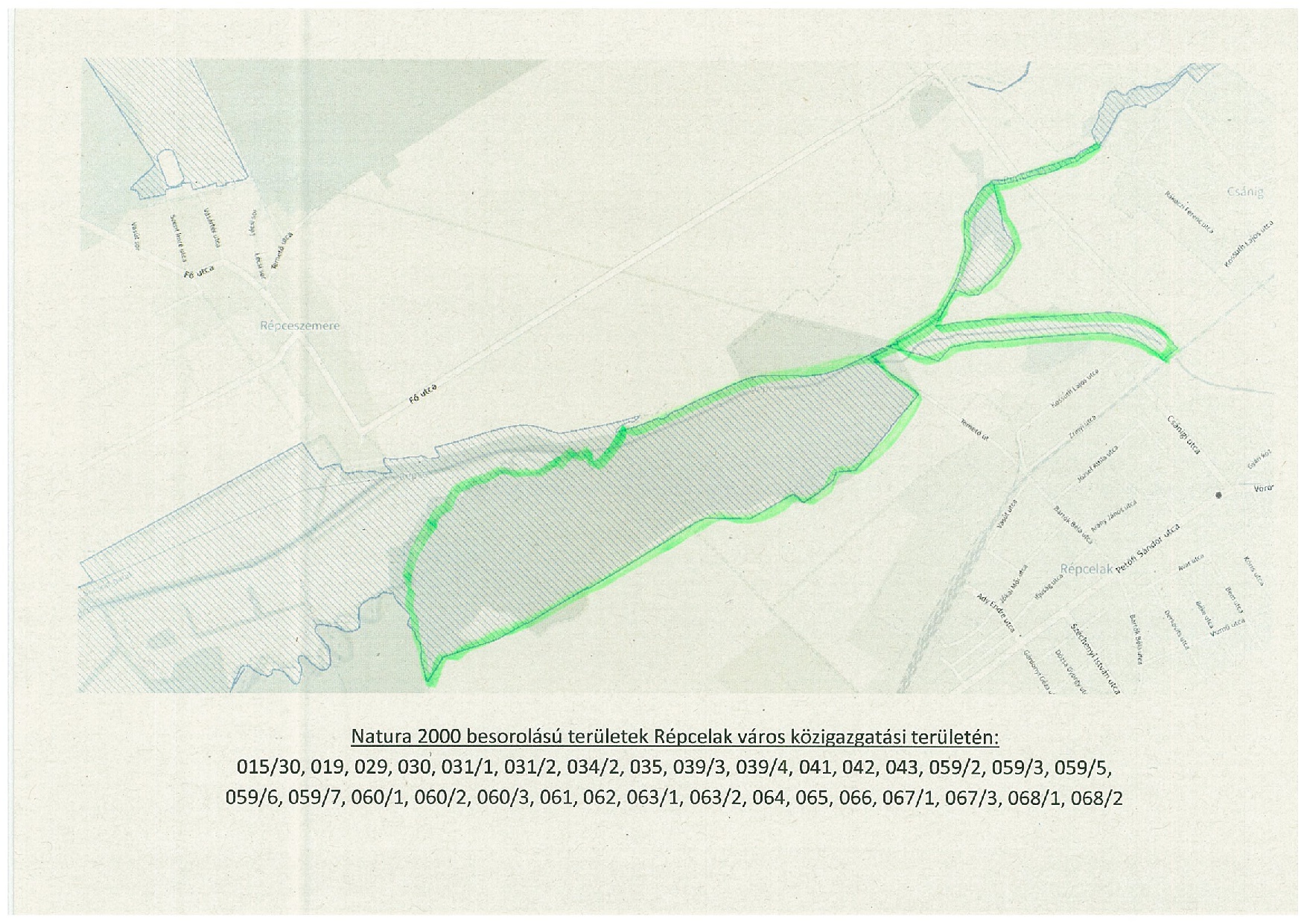 (3) A Natura 2000 ökológiai hálózattal kapcsolatos ismeretek, többek között a Natura 2000 területek kijelölésének folyamata, és a célja, a területekkel kapcsolatos természetvédelmi célú kötelezettségek, igénybe vehető támogatások, és mindezek jogszabályi háttere megtalálható az európai közösségi jelentőségű természetvédelmi rendeltetésű területekkel érintett földrészletekről szóló 14/2010. (V. 11.) KvVM rendelet 5. mellékletében. Répcelak területén a következő helyrajzi számmal ellátott területek (2. melléklet) esnek a Natura 2000 alá: 015/30, 019, 029, 030, 031/1, 031/2, 034/2, 035, 039/3, 039/4, 041, 042, 043, 059/2, 059/3, 059/5, 059/6, 059/7, 060/1, 060/2, 060/3, 061, 062, 063/1, 063/2, 064, 065, 066, 067/1, 067/3, 068/1, 068/2.