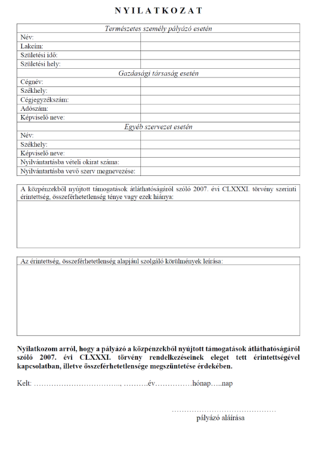 (2) A pályázathoz és az egyedi támogatási kérelemhez csatolni kell a rendelet 1. melléklete szerinti nyilatkozatot.