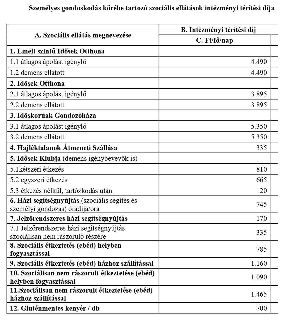 „(4) Az emelt szintű elhelyezés esetén egyszeri hozzájárulást kell fizetni, melyet az önkormányzat évente a térítési díjak emelésével egy időben, rendeletben állapít meg. Az egyszeri belépési díjat, a beköltözést követő 15 napon belül kell megfizetni. Az emelt szintű elhelyezés egyszeri hozzájárulás díja: