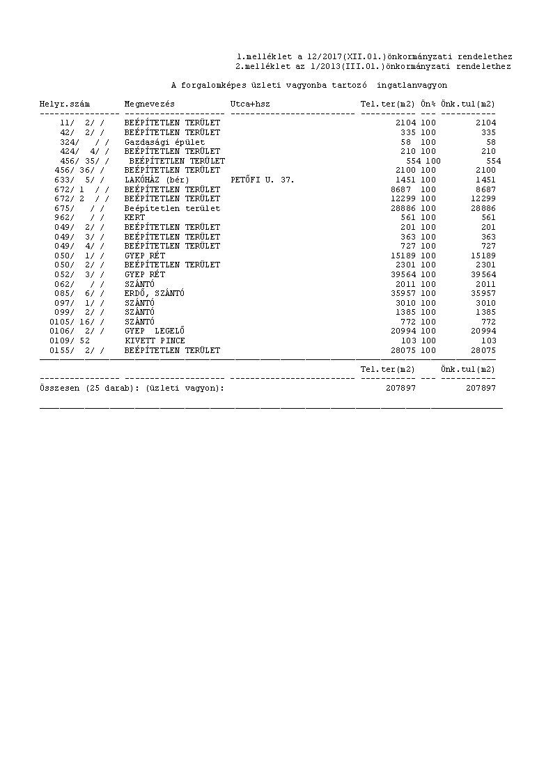 1. § Szentkirályszabadja az önkormányzat vagyonáról és a vagyongazdálkodás szabályairól szóló 1/2013.(III.01.) önkormányzati rendelet 2.melléklete helyébe az 1.melléklet lép.