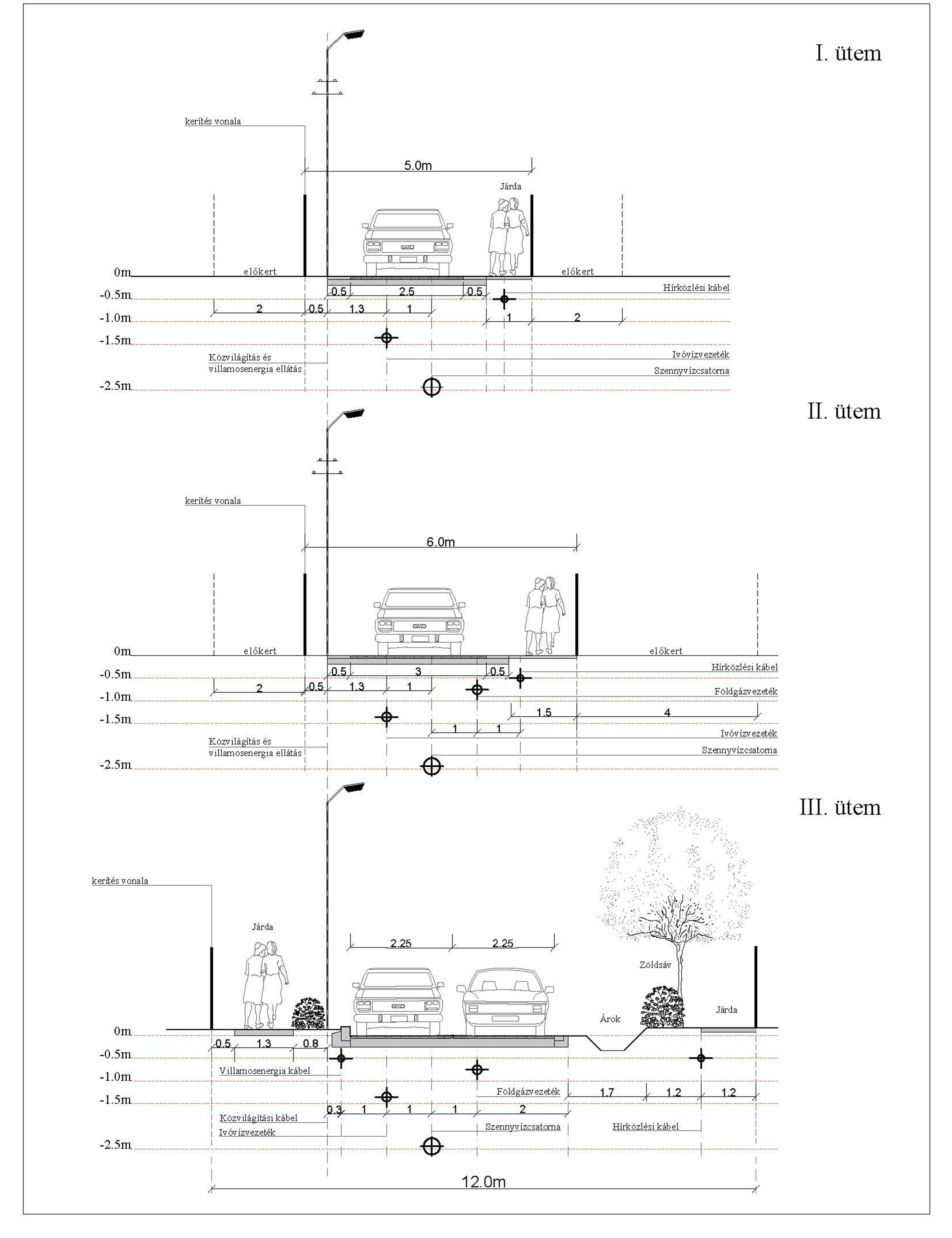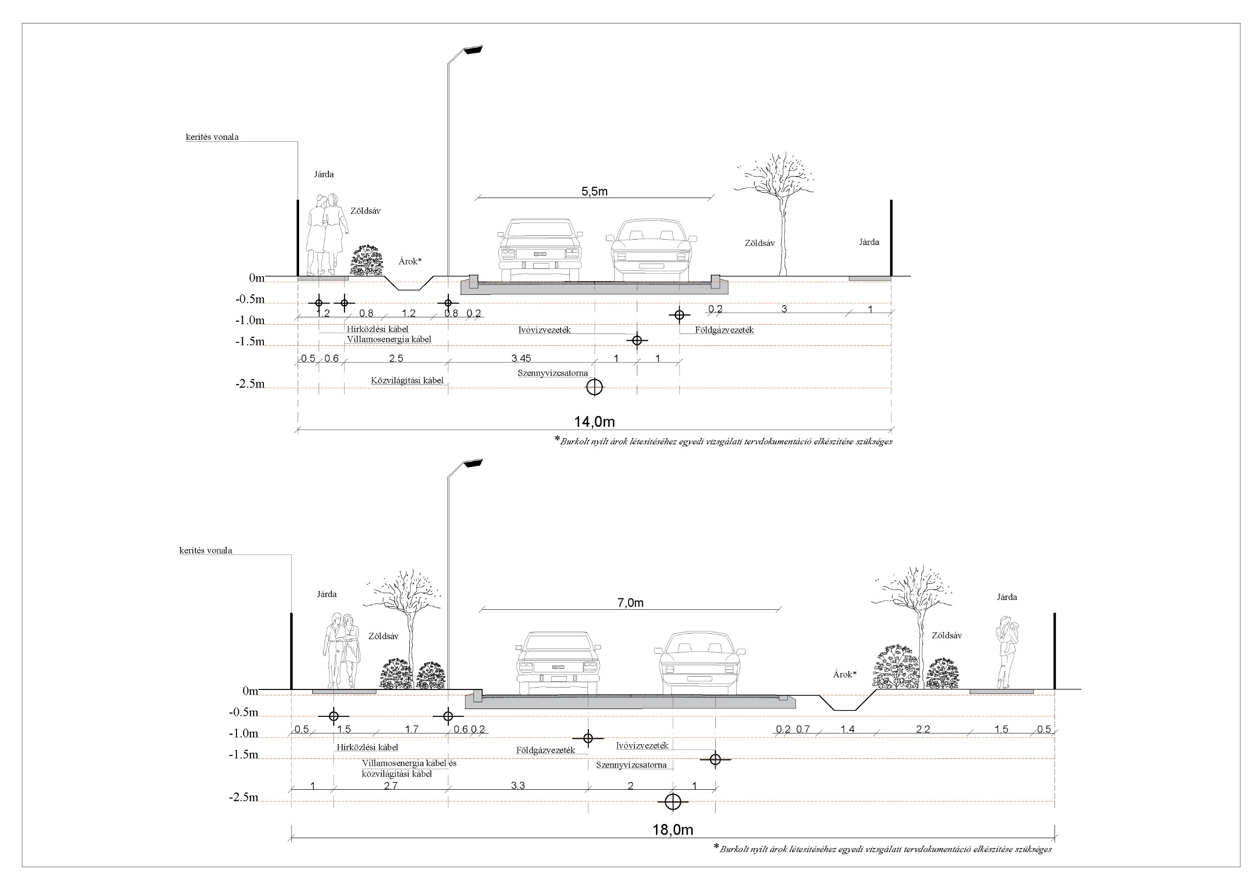 (2) Tervezett közúthálózati elem, kiszolgáló vagy lakóút és közforgalom számára megnyitott magánút megvalósítása során egyoldali, 14 m útszélesség felett kétoldali, legalább 2,0–2,0 méter szélességű zöldsávba ültetett fasor telepítendő, a közműmentes élettér biztosításával.