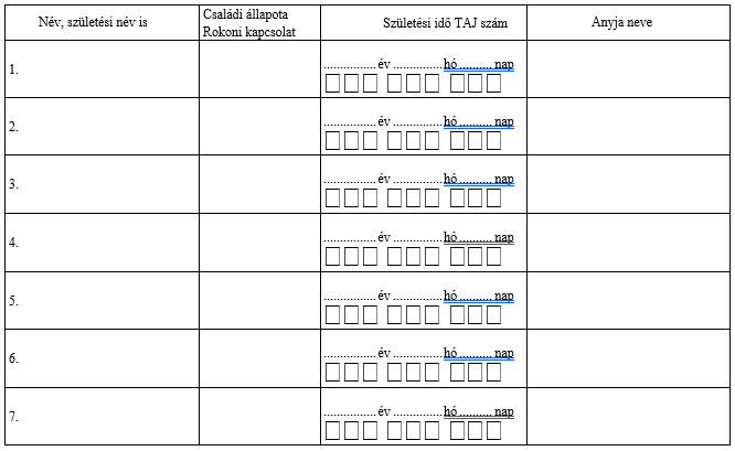 Egyéb vagyontárgyak: Gépjármű: személygépkocsi:……………………………,típus:…………………………….,rendszám:…………………a szerzés ideje ......................................................., valamint a gyártási éve:……………………………..év. Becsült forgalmi érték:………………………………Ft. A gépjármű vagyoni értéke a 1993-évi III.törv.4§ (1)bek. ba) külön-külön számított forgalmi értéke, illetőleg összege az öregségi nyugdíj mindenkori legkisebb összegének a harmincszorosát nem haladhatja meg. Család: egy lakásban, vagy személyes gondoskodást nyújtó bentlakásos szociális, gyermekvédelmi intézményben együtt lakó, ott bejelentett lakóhellyel, vagy tartózkodási hellyel rendelkező közeli hozzátartozók közössége. Tudomásul veszem, hogy a kérelemben közölt jövedelmi adatok valódiságát a szociális igazgatásról és szociális ellátásokról szóló 1993. évi III. törvény 10. § (7) bekezdése alapján a szociális hatáskört gyakorló szerv - az állami adóhatóság illetékes igazgatósága útján – ellenőrizheti. A jövedelemnyilatkozatban szereplő jövedelemről a jövedelem típusának megfelelő iratot vagy annak másolatát a kérelemhez mellékelni szükséges. A kérelemhez csatolni kell minden olyan okiratot (kórházi zárójelentés, orvosi igazolás, hatósági határozat,stb.), amely igazolja a létfenntartási gondot, illetve létfenntartását veszélyeztető rendkívüli élethelyzetet. Kijelentem, hogy a fenti adatok a valóságnak megfelelnek. Tudomásul veszem, hogy valótlan adatközlés esetén a támogatás megszüntetésre kerül a jogosulatlanul és rosszhiszeműen igénybevett támogatást a folyósító szerv kamattal megemelt összegben visszaköveteli. Dátum: …..……………………………….. …………………………………………………. …………………………………………….. kérelmező házastársa/élettársa/ kérelmező aláírása CSATOLANDÓ: egy háztartásban élők jövedelemigazolása (munkabér, családi pótlék, gyed, gyes)2. melléklet a 9/2022. (XI. 24.) önkormányzati rendelethez