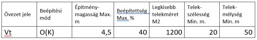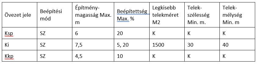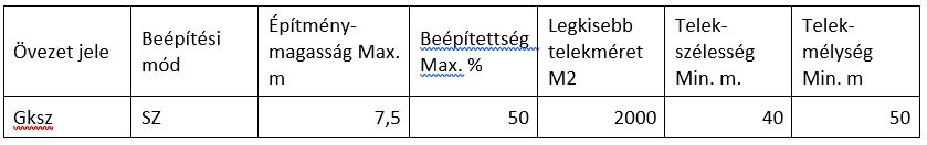 8. § (1) A területre vonatkozó szabályozási előírásokat – beépítési mód, maximális építmény magasság, maximális beépítettség, minimális telekterület – a szabályozási terv is tartalmazza, a minimális telekméretek az alábbiak szerint alakítandók ki.