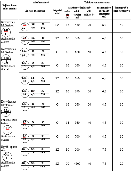 1.1 (1) A rendelet hatálya alá eső területen építési használat szerint az alábbi beépítésre szánt területek kerületk kijelölésre, melyek övezeti besorolását a szabályozási tervek (külterület, belterület) határozzák meg és határolják le. 1. lakóterület, ezen belül 1.1. kisvárosias lakóterület: Lk 1.2. kertvárosias lakóterület: Lke 1.3. falusias lakóterület: Lf 2. gazdasági terület, ezen belül egyéb iparterület: Gip 3. különleges terület K, ezen belül 3.1. nagykiterjedésű közmű terület 3.2. mezőgazdasági üzemi terület