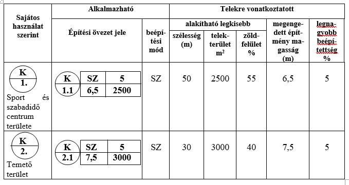 (2) A beépítésre nem szánt különleges területek övezeteinek telekre vonatkozó összefoglaló szabályozása6263: