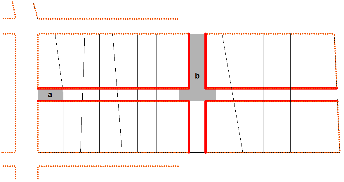 a) a tömbhatáron álló saroktelek megosztásakor a teleklábnál kialakuló közterületszakasz és