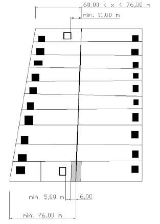 5. § 1) Beépítésre szánt területen nyúlványos (nyeles) telket csak akkor szabad alakítani, ha a telekalakítás lehetőségét