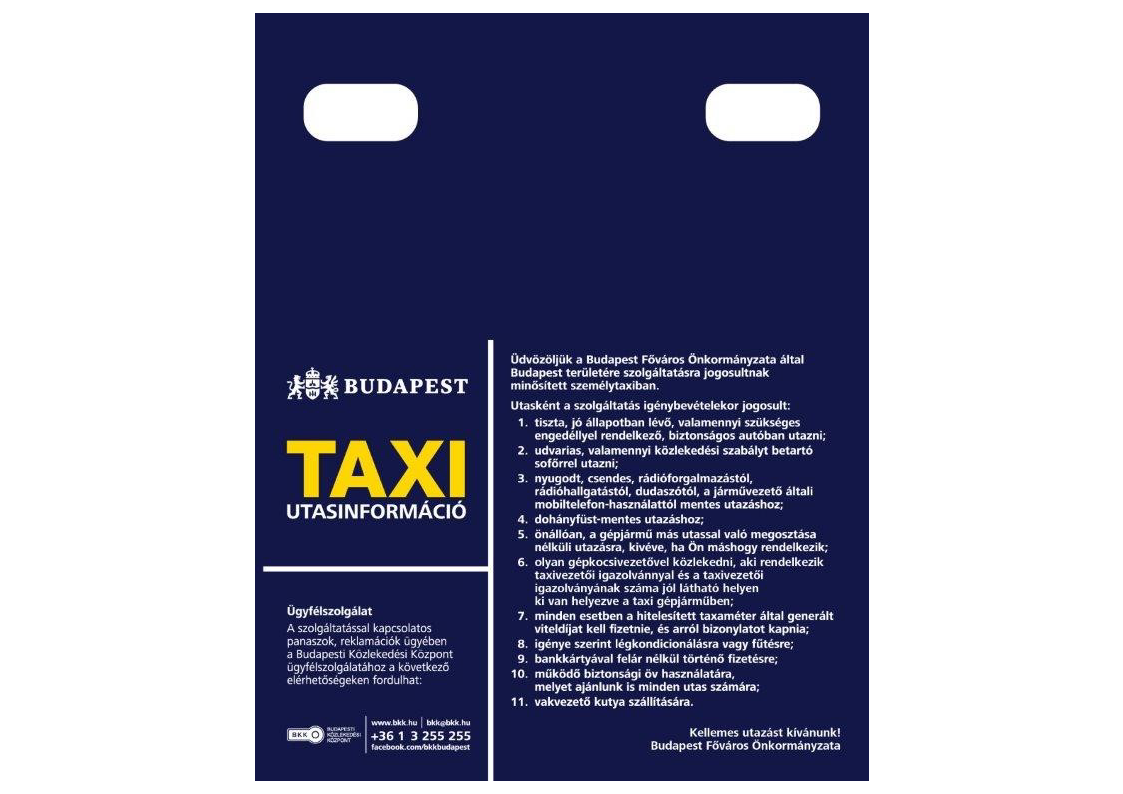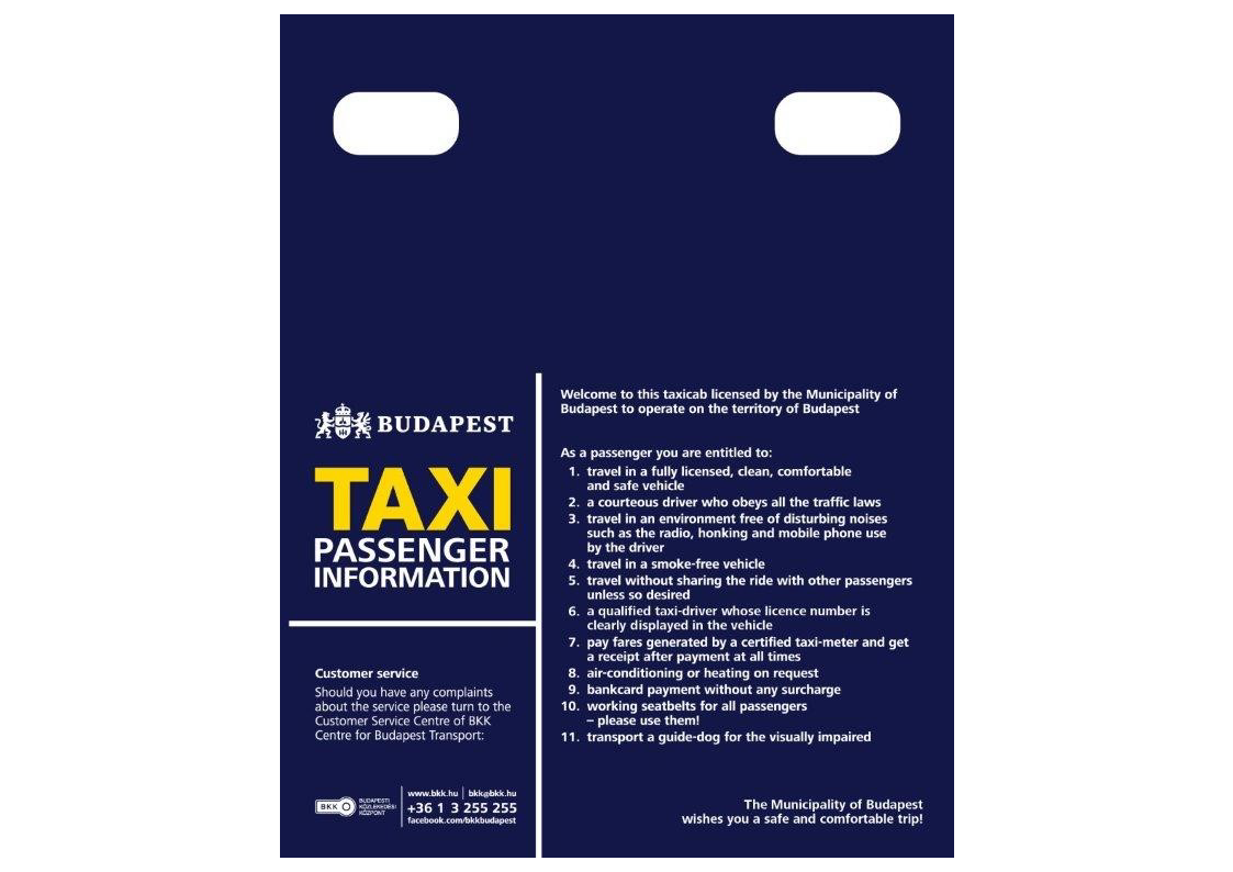 3. § (1)2 Személytaxival személyszállítási szolgáltatást kizárólag olyan járművel lehet végezni, amelyen – a külön jogszabályban előírt tartalmú tájékoztató feliraton kívül – az e rendelet 1. mellékletében meghatározott módon, formátumban és tartalommal a személytaxi-szolgáltató által alkalmazott árak, a panaszok megtételének lehetőségei, a személytaxi-gépjármű rendszáma és a járművezető személytaxi-vezetői igazolványának száma is feltüntetésre kerülnek.