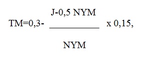 (8) A (7) bekezdés b) pontja szerinti TM kiszámítása (ahol a J a jogosult háztartásában egy fogyasztási egységre jutó havi jövedelmet, az NYM pedig az öregségi nyugdíj mindenkori legkisebb összegét jelöli. A TM-et századra kerekítve kell meghatározni) a következő módon történik: