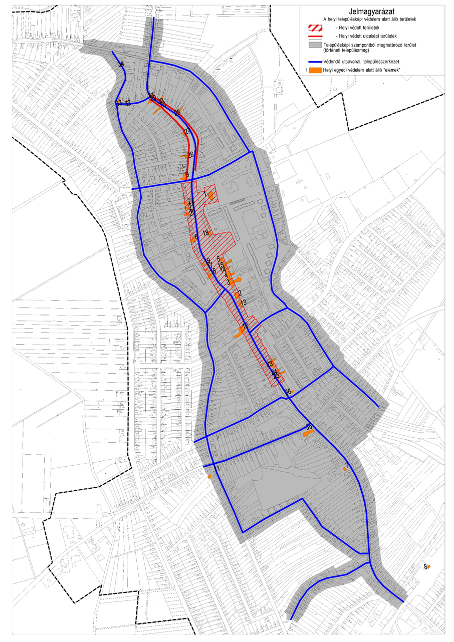 4. Helyi területi védett utcakép: jellemzően két útkereszteződés közötti, 4-4 beépített telket magába foglaló, a hagyományos településkép, településkarakter megőrzése szempontjából értékes utcarész, ahol a tömegformálás, az építészeti karaktert, illetve a telepítés védendő.