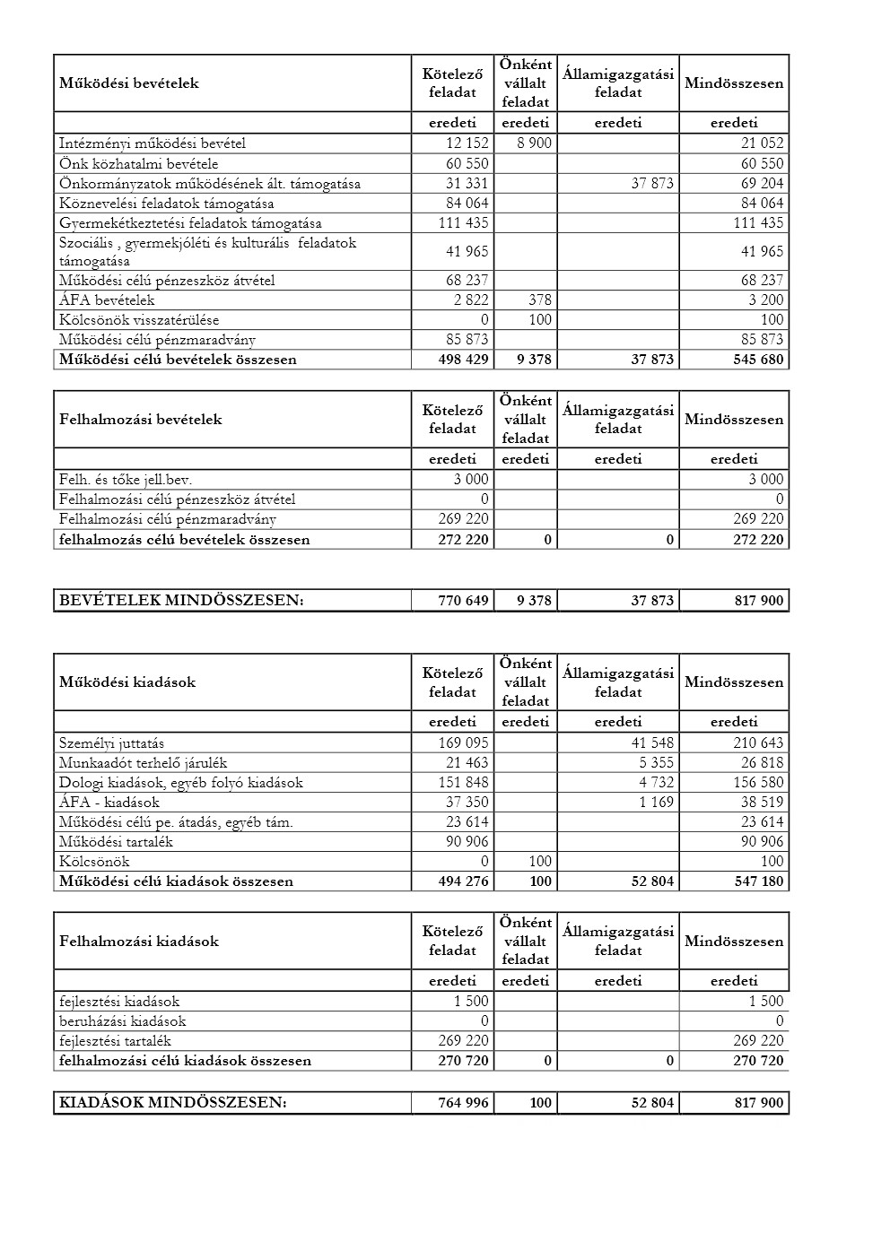 (2) A Képviselő-testület az önkormányzat költségvetésének 2023. évi bevételi és kiadási fő összeget 817.900. eFt-ban állapítja meg.