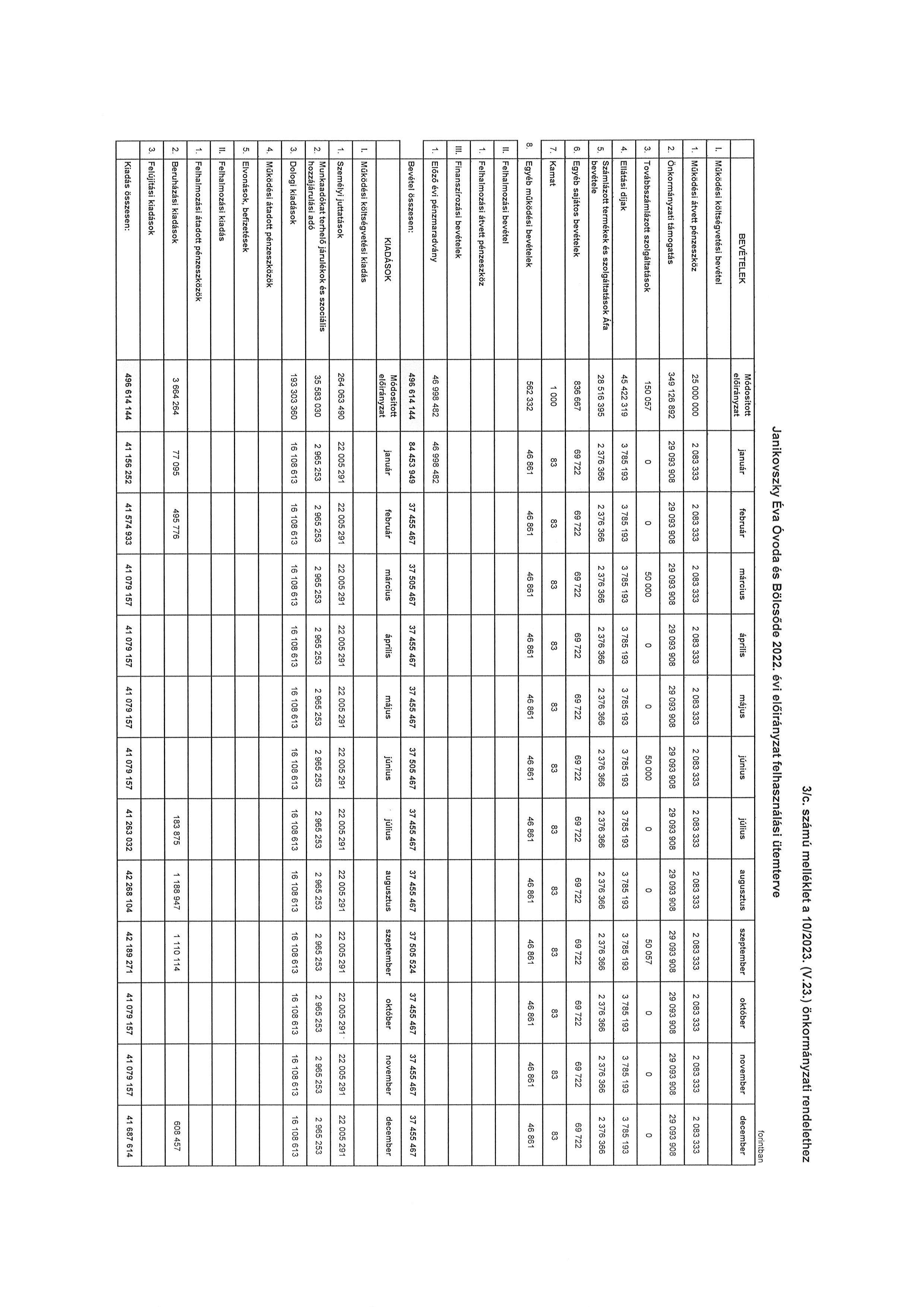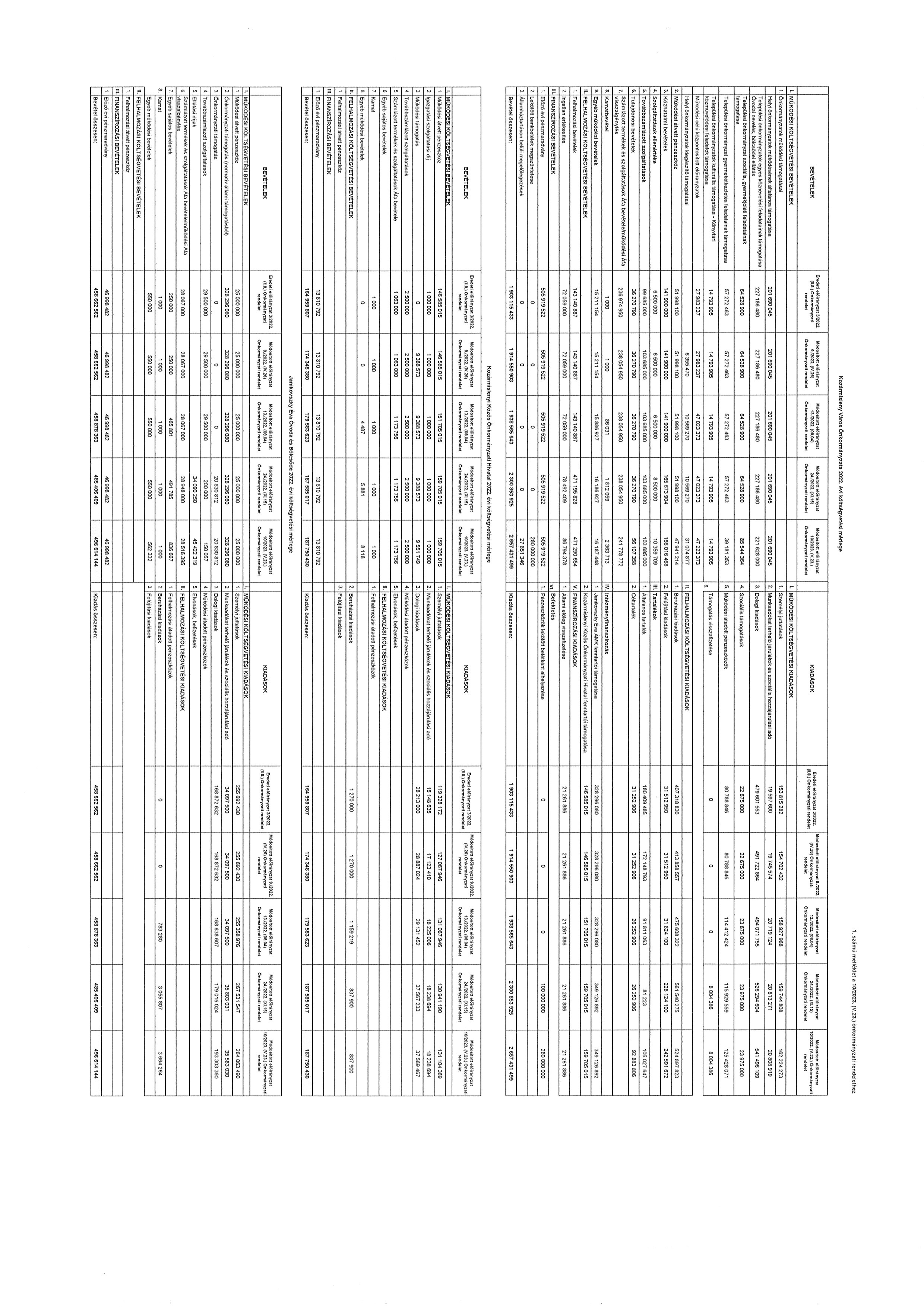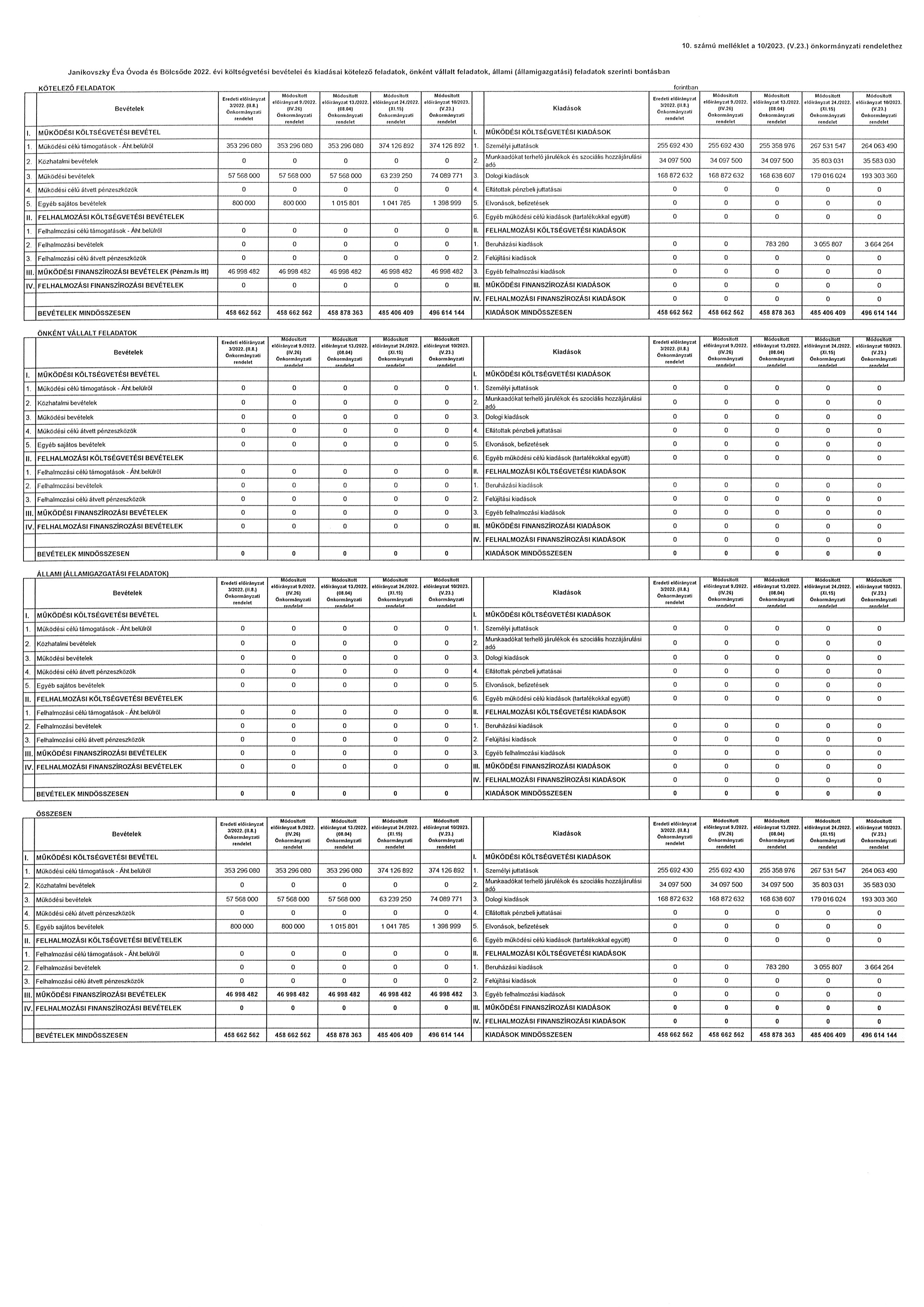 A költségvetési évet követő három év tervezett bevételi előirányzatainak és kiadási előirányzatainak keret tervszámait főbb csoportokban a 11. számú melléklet tartalmazza. Janikovszky Éva Óvoda és Bölcsőde 2022. évi költségvetési bevételei és kiadásai kötelező feladatainak tervszámait, önként vállalt feladatainak tervszámait, állami (államigazgatási) feladatainak tervszámait a 10. számú melléklet tartalmazza.”