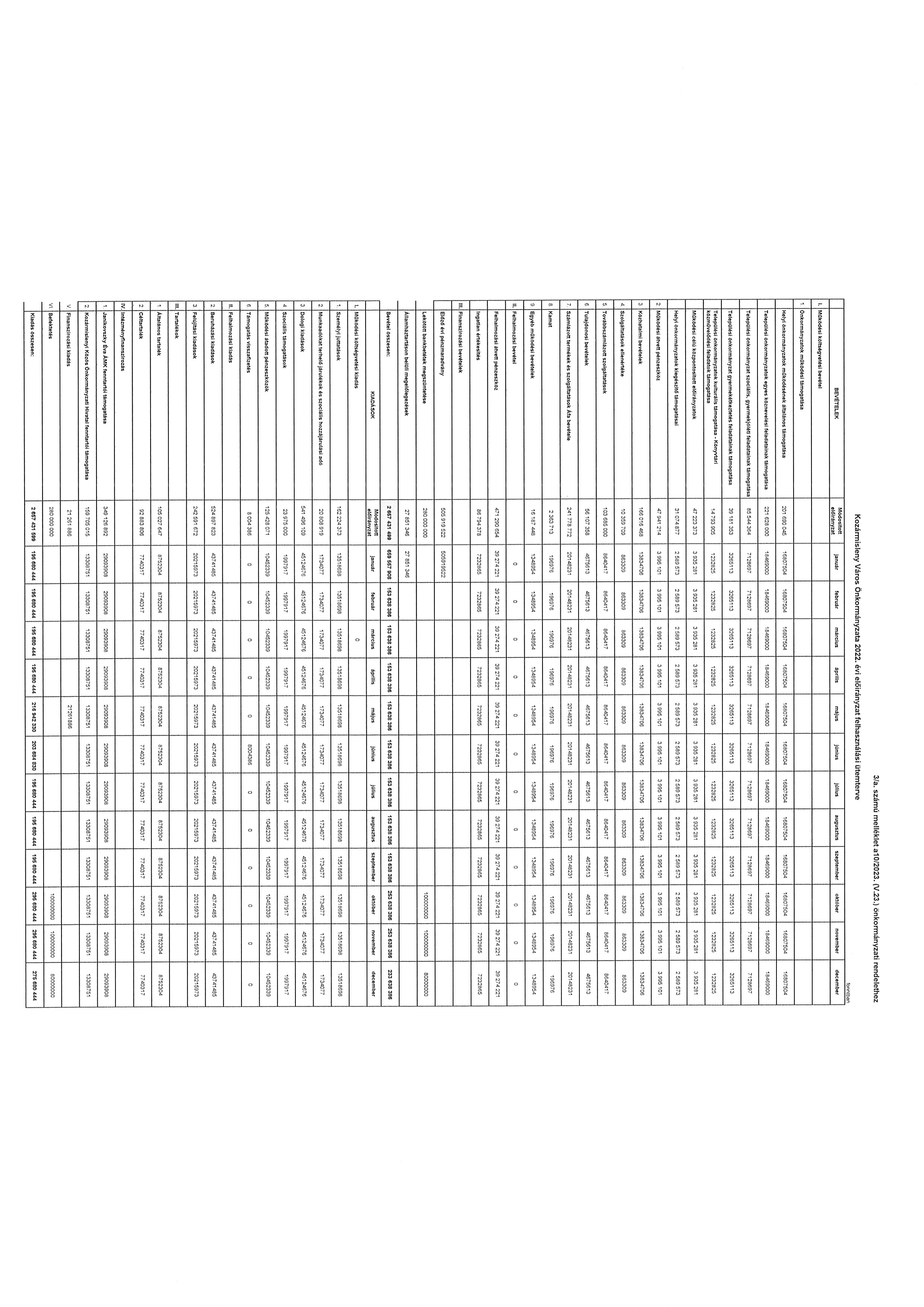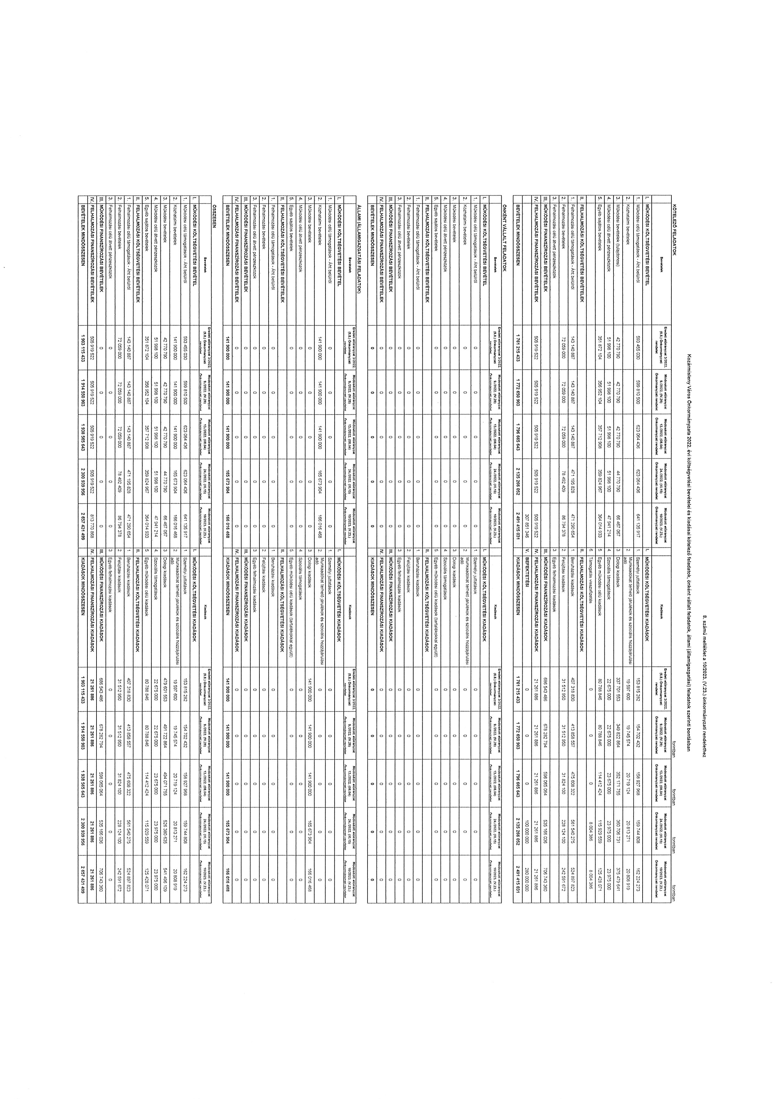 A költségvetési évet követő három év tervezett bevételi előirányzatainak és kiadási előirányzatainak keret tervszámait főbb csoportokban a 11. számú melléklet tartalmazza. Kozármisleny Város Önkormányzata 2022. évi költségvetési bevételei és kiadásai kötelező feladatainak tervszámait, önként vállalt feladatainak tervszámait, állami (államigazgatási) feladatainak tervszámait a 8. számú melléklet tartalmazza.”