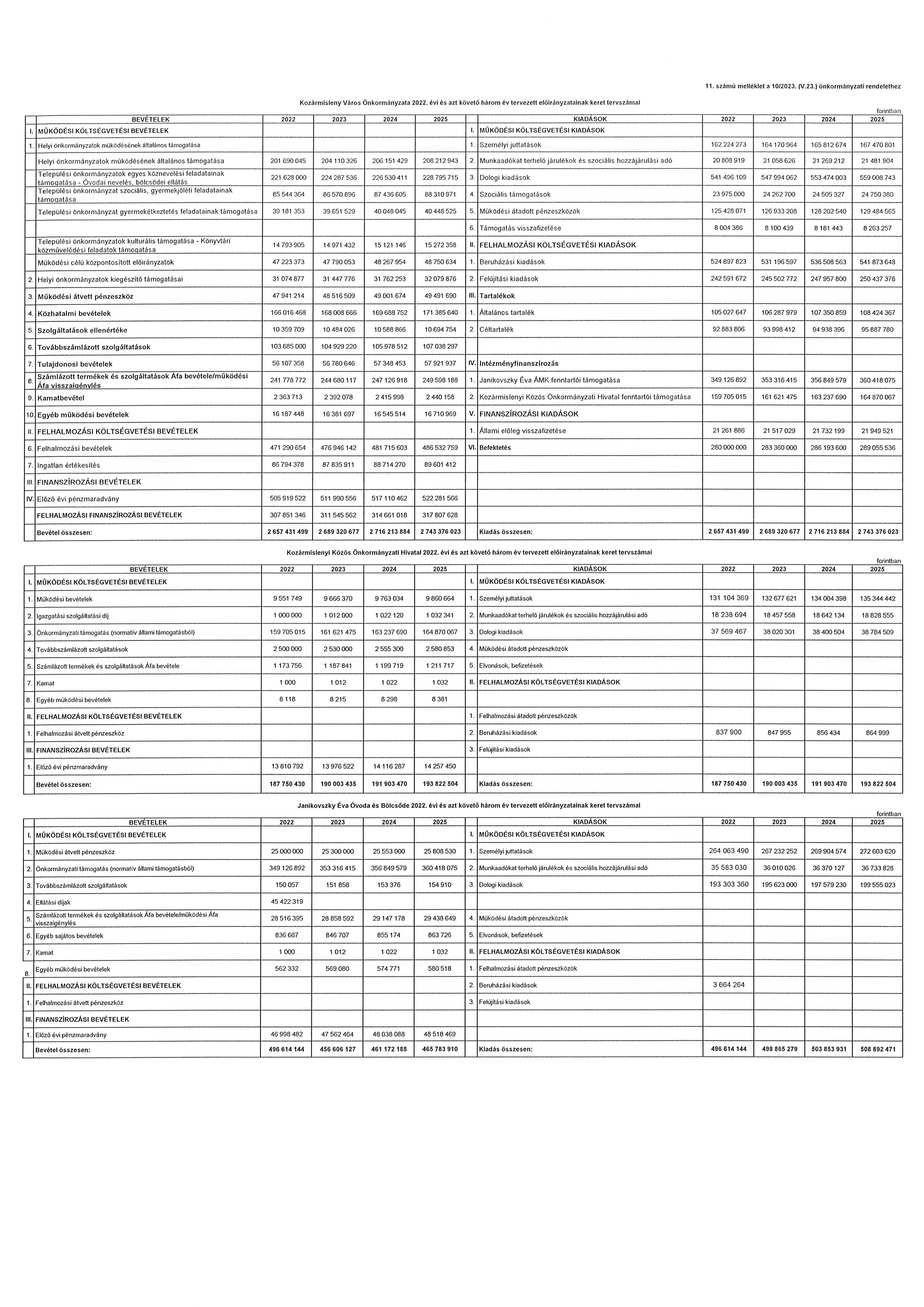 A költségvetési évet követő három év tervezett bevételi előirányzatainak és kiadási előirányzatainak keret tervszámait főbb csoportokban a 11. számú melléklet tartalmazza. Kozármislenyi Közös Önkormányzati Hivatal 2022. évi költségvetési bevételei és kiadásai kötelező feladatainak tervszámait, önként vállalt feladatainak tervszámait, állami (államigazgatási) feladatainak tervszámait a 9. számú melléklet tartalmazza.”