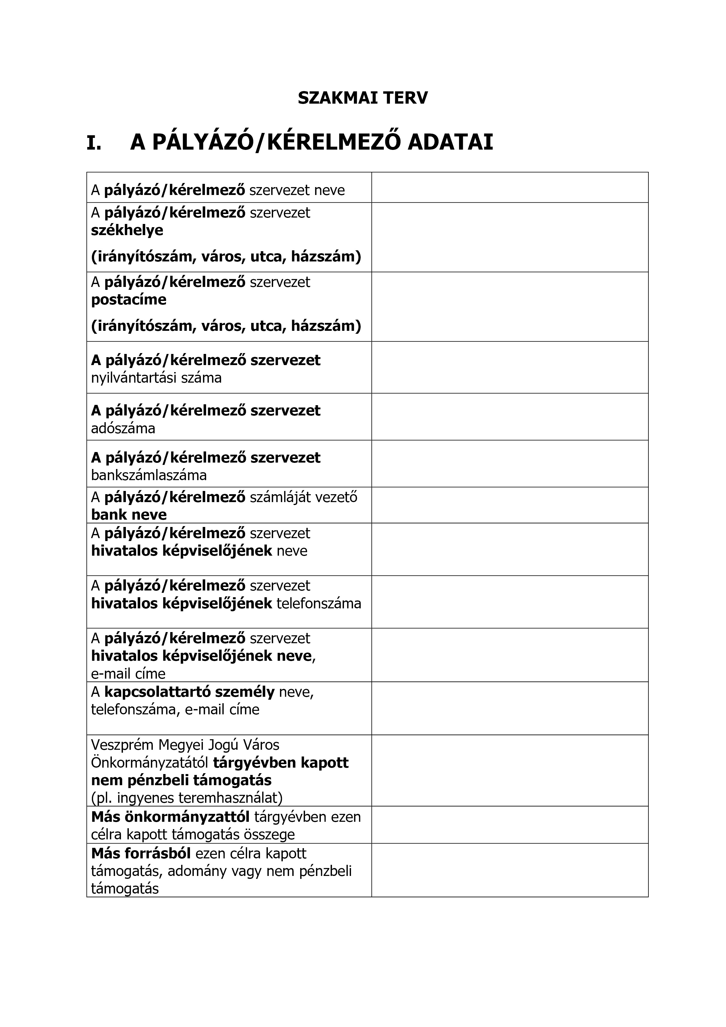 „1. Szakmai terv, a pályázó/kérelmező adatai