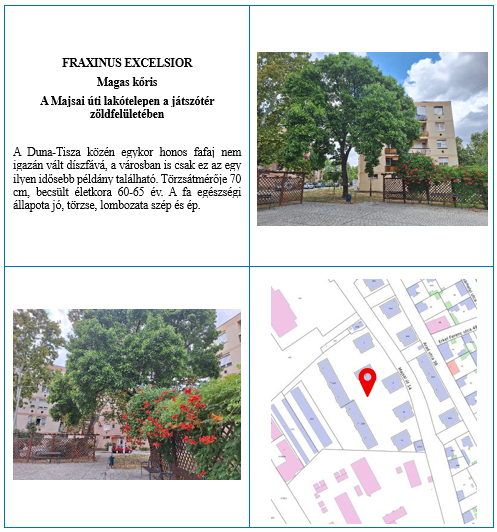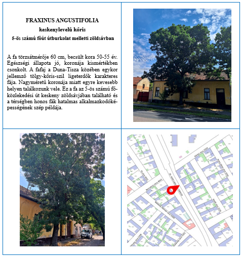 Zrínyi u. 11. szám előtt az útburkolat melletti zöldsávban keskenylevelű kőris |